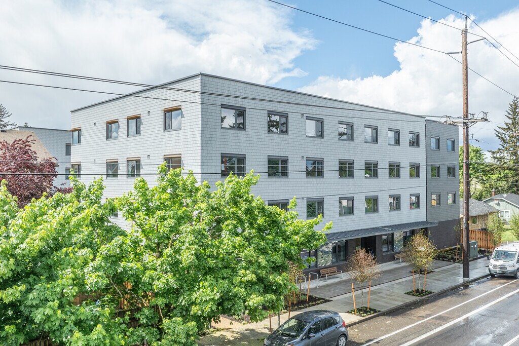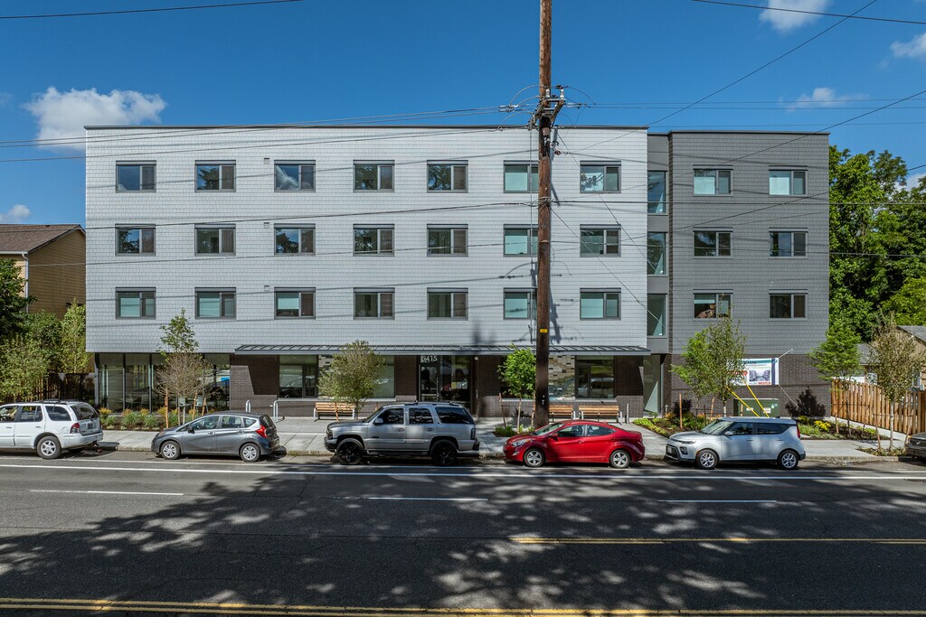 Discover Powellhurst Residences, a contemporary apartment complex in the heart of Powellhurst. This four-story structure offers 65 affordable 1- and 2-bedroom units surrounding a vibrant central court. Located on SE 122nd Avenue, a designated Civic Corridor, it boasts excellent transit access and proximity to parks, schools, and shopping.Step into a welcoming lobby featuring communal spaces, mail and package rooms, and a common room with a kitchenette. The courtyard, enclosed by residences, showcases lush landscaping and a children's play area. Additional seating on 122nd Avenue fosters a connection to the lively street.The building's masonry base, extensive entrance canopy, and large glazed storefronts create an inviting atmosphere. Above, cementitious shingles and high-performance vinyl windows bring abundant daylight into the units and hallways, enhancing the sense of space. Sunshades, a low-slope roof accommodating HVAC units and photovoltaic panels, contribute to energy efficiency and comfort.Powellhurst Residences is more than an apartment building; it's a sustainable, community-focused living space designed for modern urban living.