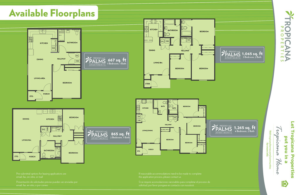 Presidio Palms offers one, two, three, and four-bedroom units. Come and tour this quaint community located in San Elizario just minutes from El Paso. If you are looking to stay on budget without losing out on quality, then Presidio Palms is where you want to be. Come and see that affordability and high quality can go hand in hand. Tour one of our fully tiled units equipped with a washer and dryer as well as fully furnished kitchen appliances. The community also provides FREE support services at the property: Homebuyer Counseling, Legal Assistance, Credit Counseling, Financial Literacy, Nutrition Counseling, FREE GED classes, and ESL (English as a Second Language) training. Our management and maintenance team strives to provide the best living environment possible. So stop on in today and let Tropicana put you into your next new home.