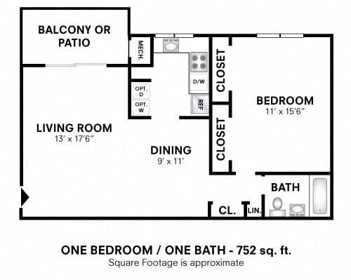 Apartment Model: One Bedroom - 752 sqftFrom $1,2301 Bedroom, 1 Bath, 660-752 sq ftAvailable Now![]()