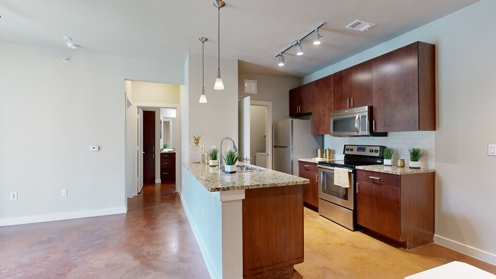 Promesa is a new apartment community that was developed with sustainability in mind. The property offers apartments in Austin, TX with stunning one, two and three bedroom designs. All of the open apartments feature spacious kitchens with large islands and breakfast bars. Each of the stunning living rooms connects to a spacious patio or balcony where residents can relax after a stressful day with a cool beverage. Every home at Promesa features a patio or balcony, so residents have beautiful views of the surrounding hill country setting. The homes are finished with vinyl wood floors or stained concrete for a modern feel. Every bedroom in the community features soft carpeting to keep you feeling comfortable and oversized closets to keep you organized. The master suites boast exclusive bathrooms with espresso or café cabinets, granite countertops and framed mirrors.