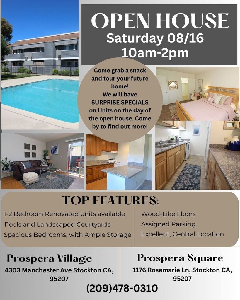 At Prospera Square, we believe home should be more than just a place to live—it should be a place to grow. Located in the heart of vibrant Stockton, our beautifully maintained community is designed to bring comfort, convenience, and connection to your everyday life. Enjoy two sparkling swimming pools, complete with enhanced landscaping, outdoor seating areas, and grilling stations—perfect for relaxing weekends or hosting friends. We make daily living easy with onsite laundry facilities and in-unit washer/dryer hookups available in several of our renovated apartment homes. Every apartment also includes a private patio or balcony with a locked storage closet, giving you secure, extra space right at home. Our onsite leasing and maintenance teams are here to support you, and our inviting leasing center serves as the heart of our community, where we regularly host resident appreciation events to bring neighbors together. Contact us today to schedule your personal tour and discover why Prospera Square is the perfect place to call home.