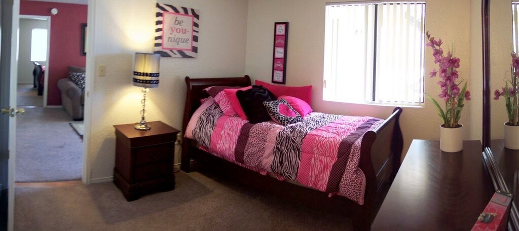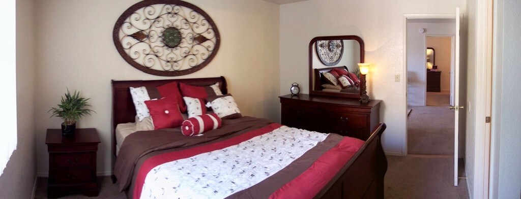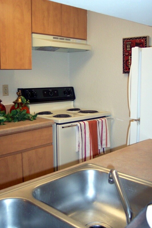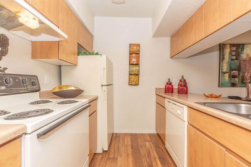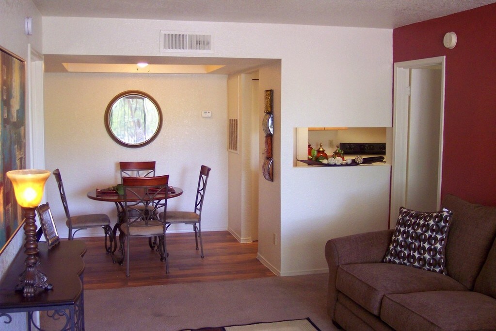 The Puesta del Sol, you can choose from one or two bedroom apartment homes for rent. These cozy apartments come cable ready and include an all-electric kitchen, with a dishwasher, a refrigerator, and a pantry. All homes include ceiling fans, central air and heating, carpeted floors, extra storage, vertical blinds, walk-in closets, a balcony or a patio, and covered parking. Select homes feature vinyl hardwood-style flooring and 9-foot vaulted ceilings.