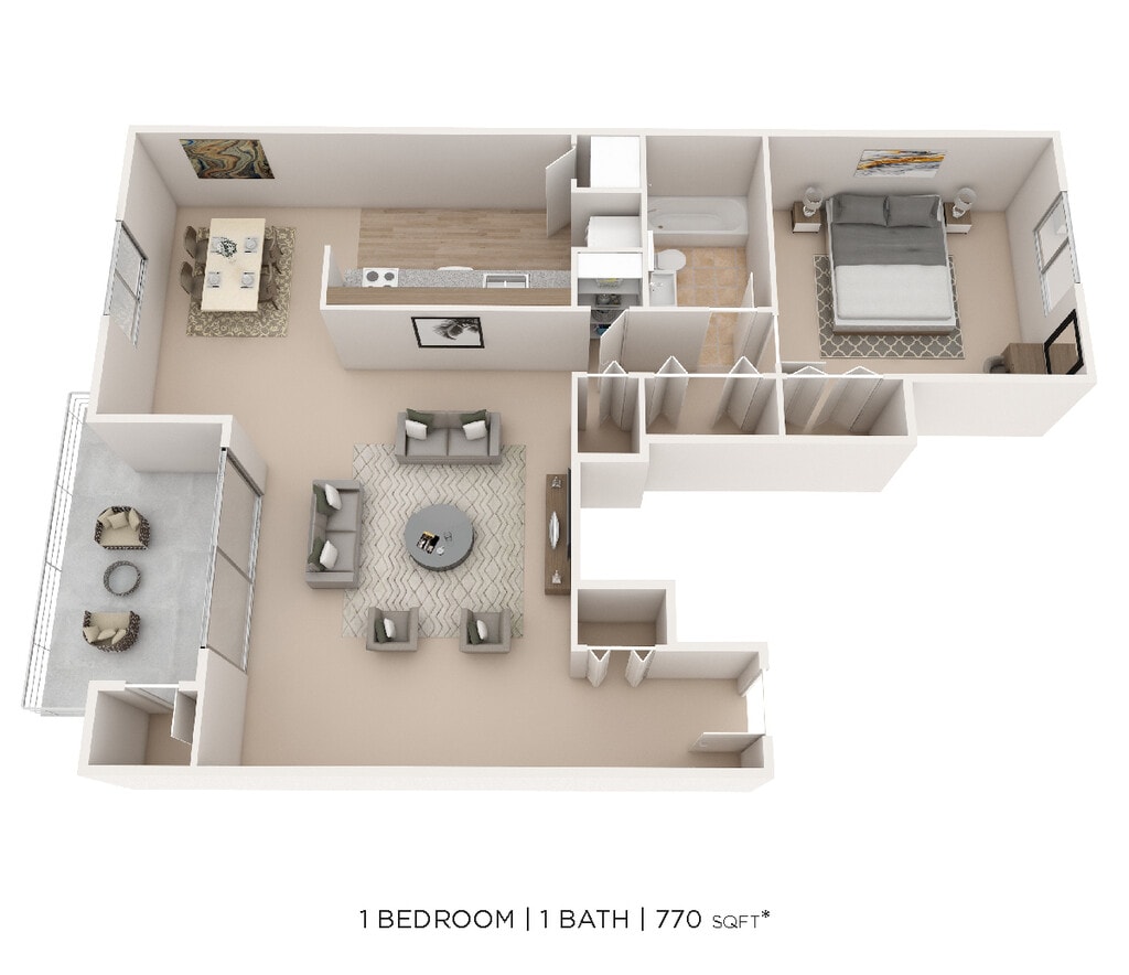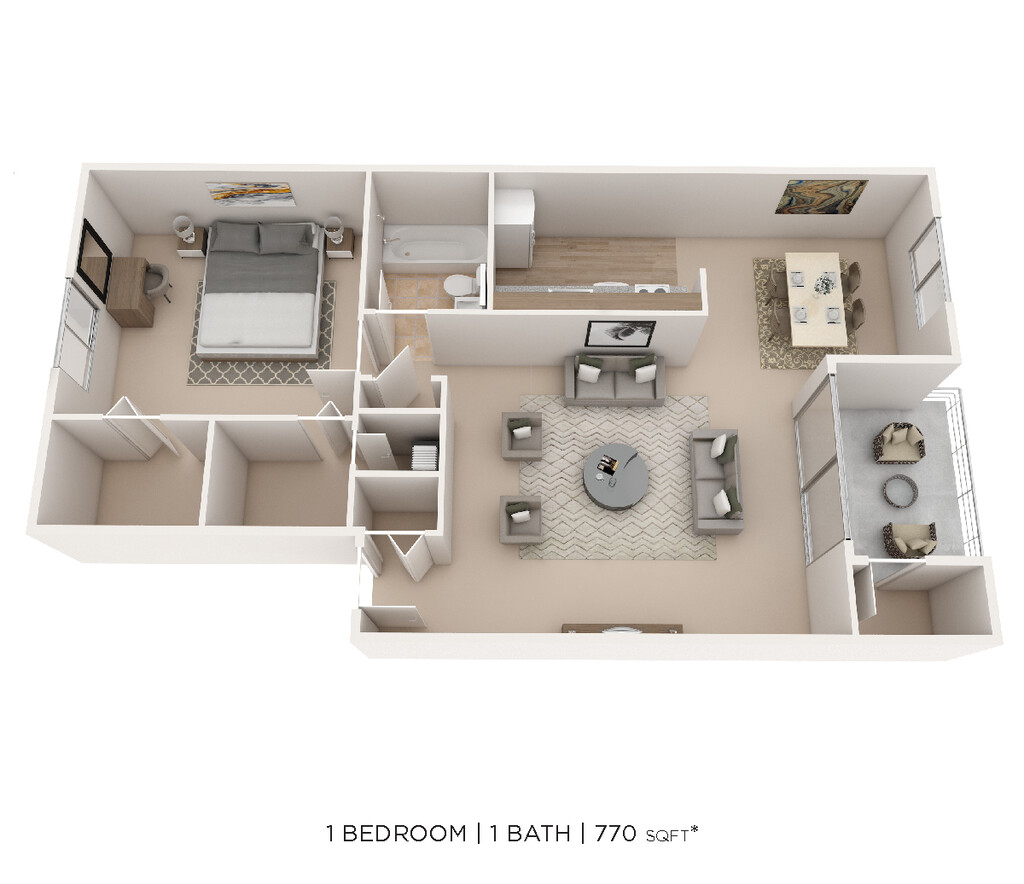 One Bedroom - Floorplan 4 Apartment Unit: 408WD-BApartment Model: One Bedroom$1,3851 Bedroom, 1 Bath, 770 sq ftAvailable NowApartment Unit: 7906VC-DApartment Model: One Bedroom$1,4951 Bedroom, 1 Bath, 770 sq ftAvailable NowApartment Unit: 414SC-EApartment Model: One Bedroom$1,5251 Bedroom, 1 Bath, 770 sq ftAvailable Now2 Bedrooms