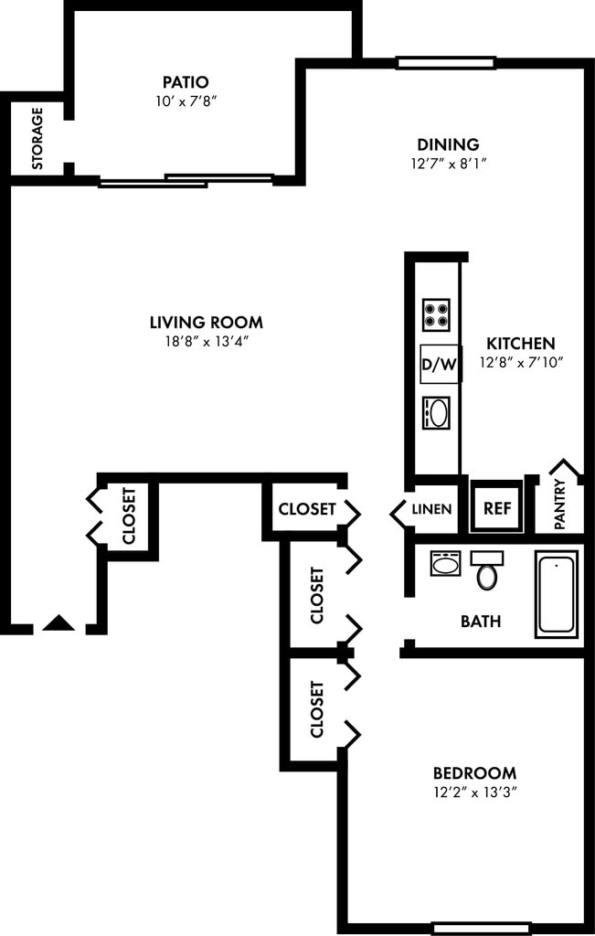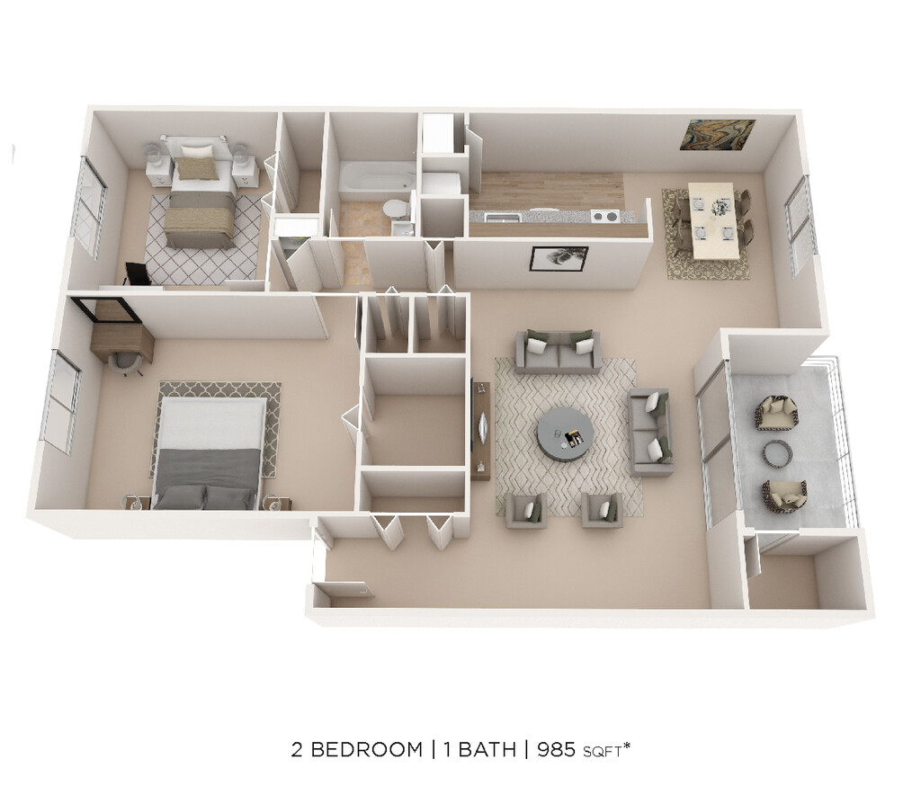 Apartment Model: Two Bedroom - 985 sqftFrom $1,5652 Bedroom, 1 Bath, 985 sq ftAvailable Now![]()