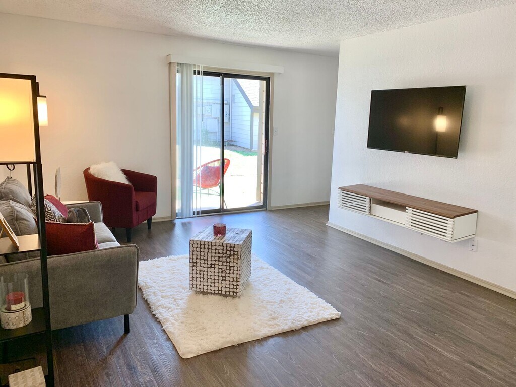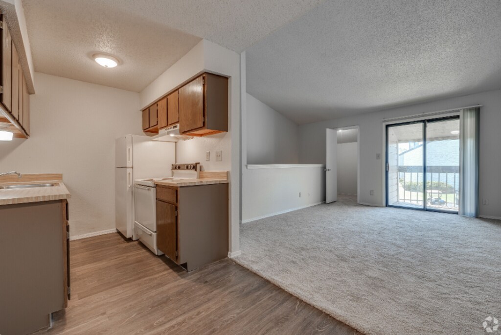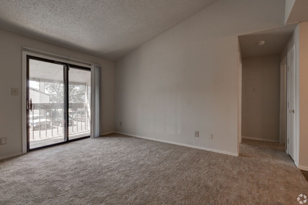 Our largest one bedroom, one bathroom floorplan with walk in closet, open kitchen, private balcony, and vaulted ceiling!