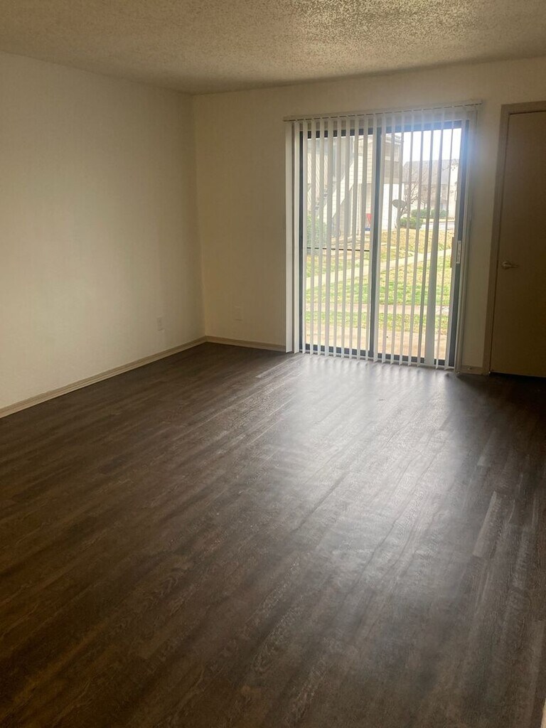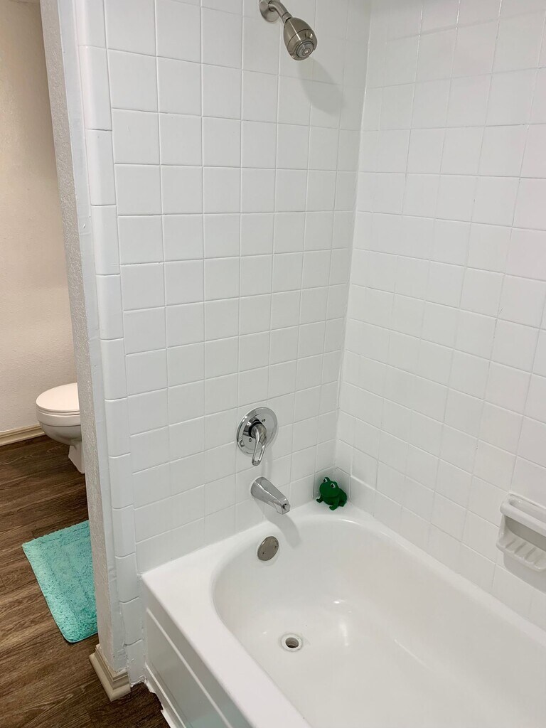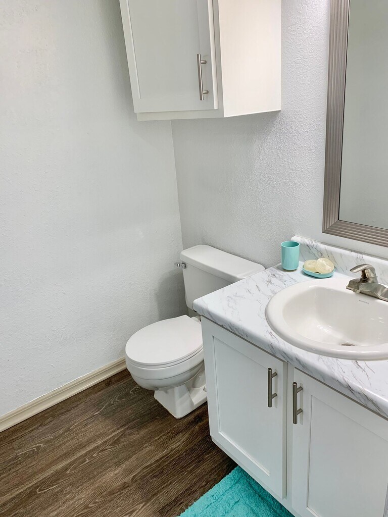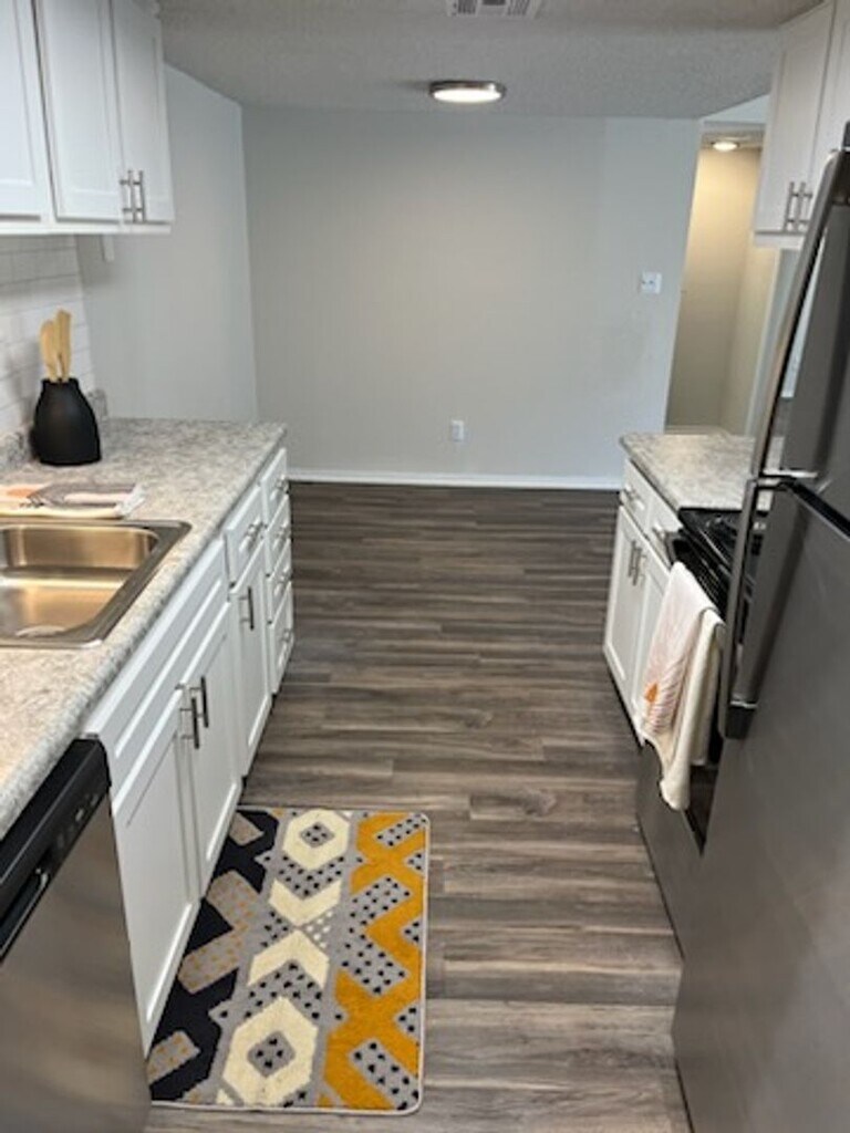 Our largest one bedroom, one bathroom floorplan with walk in closet, open kitchen, and private patio! Enjoy the convenience of first floor living in a beautiful setting with plank wood flooring, new appliances, LED fixtures, and white shaker style cabinets!