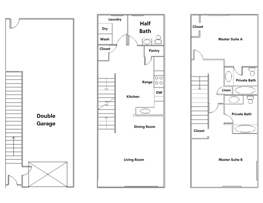 These beautiful townhomes are conveniently located adjacent to NDSU and are just a quick walk to campus, restaurants, bookstores, coffee shops and a gas station! In our three bedroom floorplans, the main level of the unit provides a private entrance, a tandem double-stall garage with opener, and a walk-out to a grass courtyard. The second floor features a hallway coat closet, a good-sized bedroom with a walk-in closet, a full bathroom, an open L-shaped kitchen with ample cabinets and an informal living room. The third-floor level hosts the other 2 spacious bedrooms (one with a walk-in closet, the other with a standard closet), a large full bathroom with extra storage, a hallway storage closet, and a laundry area with washer/dryer and shelving. Our two bedroom floorplans have a similar first-floor private entrance compared to our other three bedroom units. The second floor features a half bath for guests and walk-in linen room with washer and dryer. The large kitchen features granite counter tops and pantry. The top floor has two bedrooms with their own bathrooms.