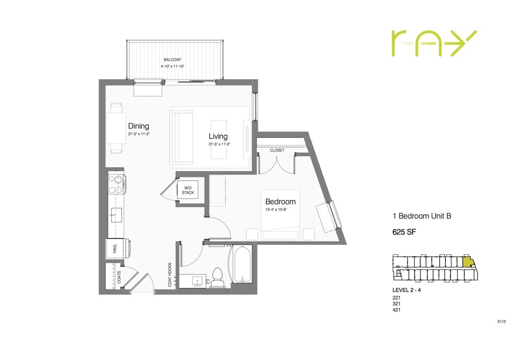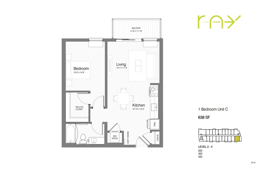 RAY offers Studio to 2 Bedroom apartments starting from $1,058 and having 356–955 sq ft. Here is the current pricing and availability:
