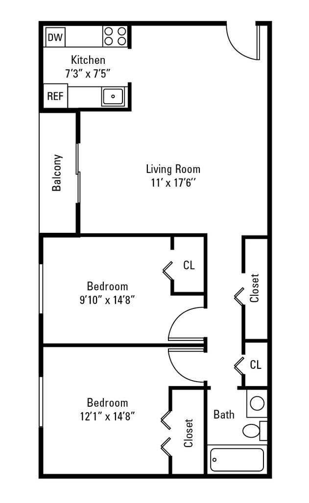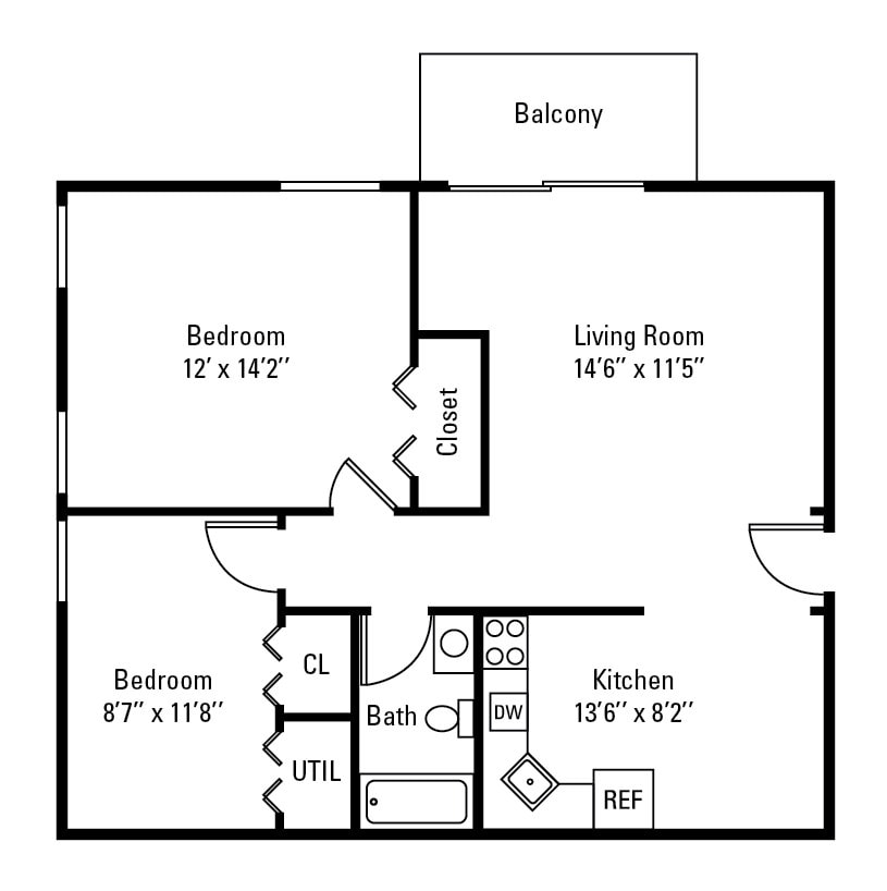 One Bedroom- 625 sqft - Floorplan 2 Apartment Unit: 62-04Apartment Model: One Bedroom- 625 sqft$1,3801 Bedroom, 1 Bath, 625 sq ftAvailable December 5, 20252 Bedrooms