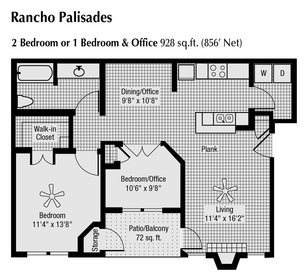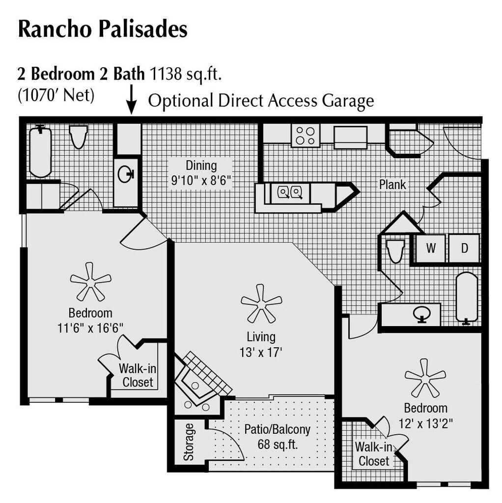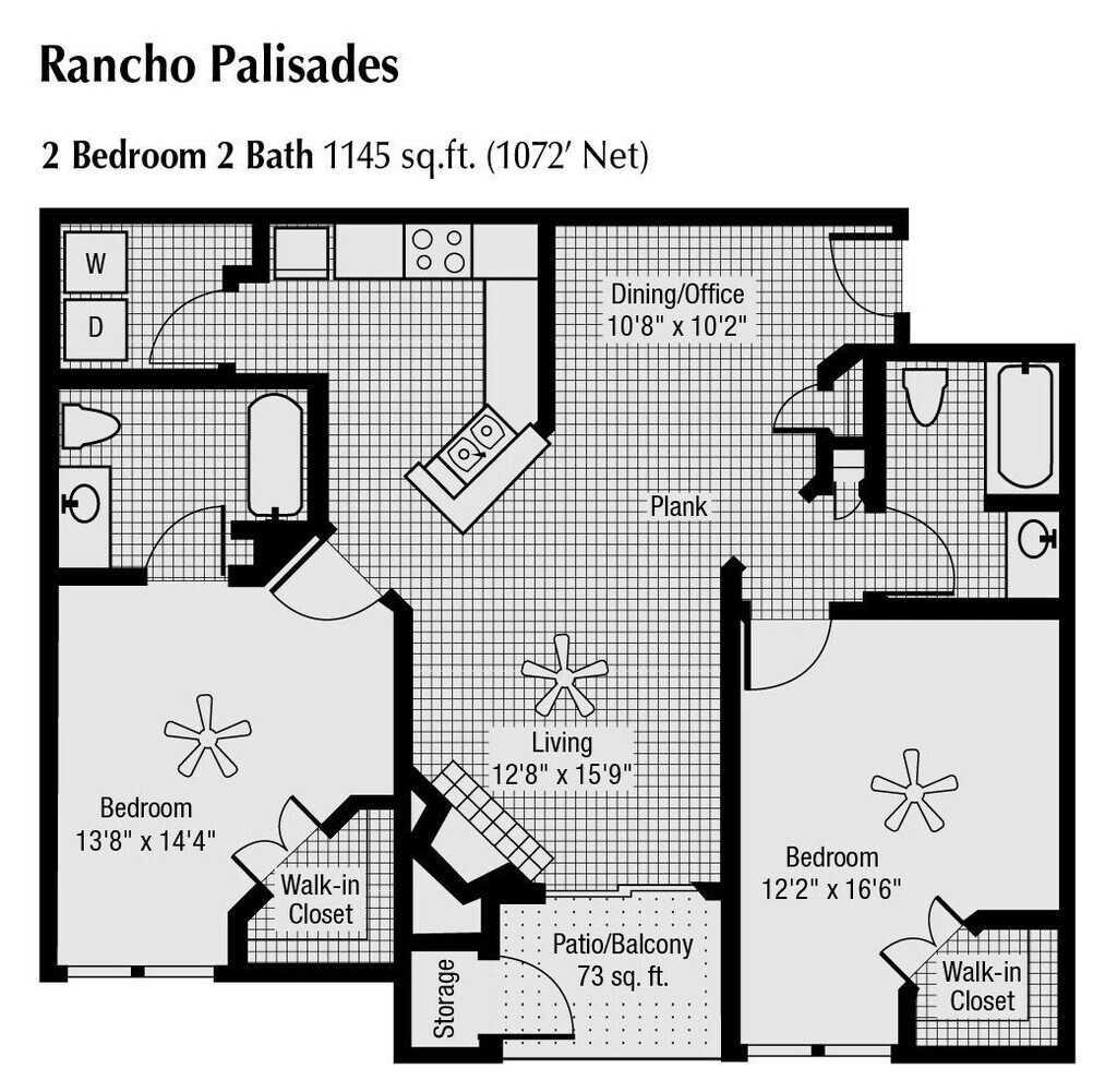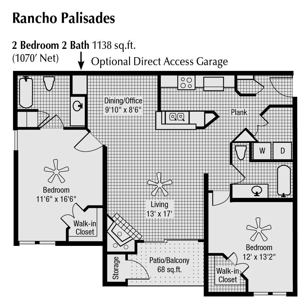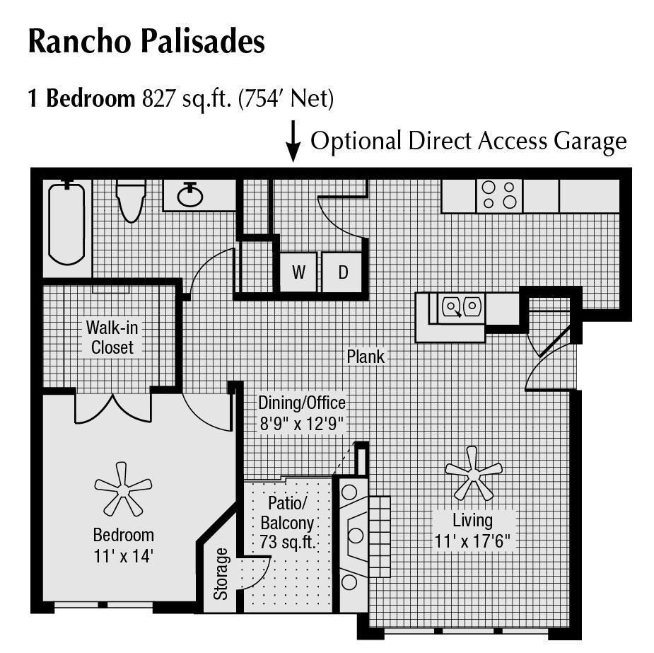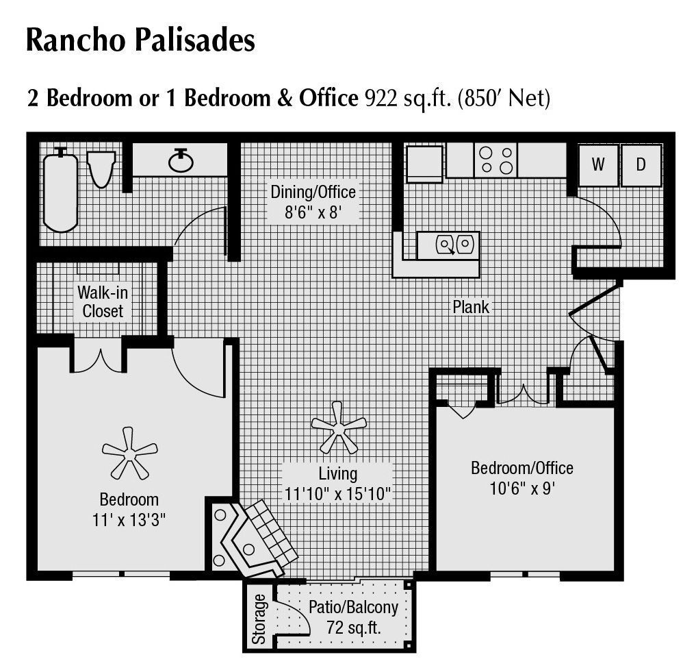 Rancho Palisades offers 1 to 2 Bedroom apartments starting from $1,174 and having 650–1,243 sq ft. Here is the current pricing and availability:
