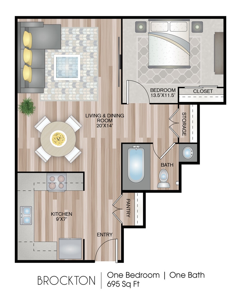 Apartment Model: Brockton$1,9101 Bedroom, 1 Bath, 695 sq ftAvailable Now![]()