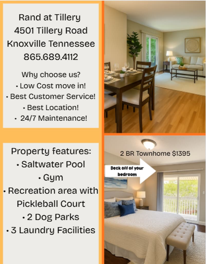 Our residents rave about our vibrant neighborhoods, unbeatable locations, and exceptional customer service—we believe that you will too! Apartment Home Features: Updated kitchens Fully equipped with stove, refrigerator, dishwasher, and garbage disposal Luxury vinyl plank flooring with a hardwood look Spacious floor plans with generous closet space Community Amenities: Saltwater pool Fitness center Recreation area with cornhole boards and a pickleball court Two dog parks for your furry friends Prime Location: Quick access to I-275, I-75, I-640, and I-40 Surrounded by diverse dining, grocery stores, and shopping Near Victor Ashe Park Just 30 minutes from Norris Lake Exceptional Service, Every Step of the Way: 24/7 emergency maintenance On-site leasing office Pet-friendly community Low-cost move-in options Automatic payment options available Pay online or in the office (please note: no cash accepted on site) Give us a call or stop by our office at 4501 Tillery Road, Knoxville Tn 37912 for more information or to take a tour of the property (Apartment tours subject to availability. We do not use models).