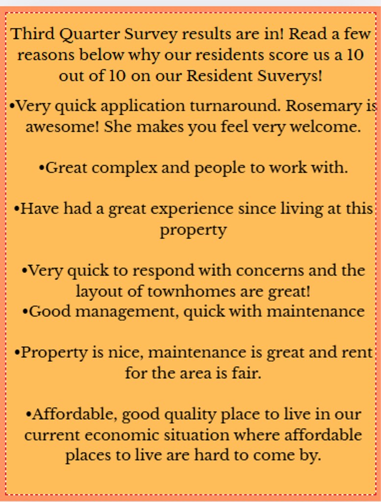 September 12, 2017I've lived at Tanglewood for a couple years now, and I honestly love it here! No place is perfect, especially with apartment complexes, but it's really quite lovely here. We'll start with the outside: The grounds are kept up with, mowed regularly, the pool is always clean and well maintained. The community is very quiet, and welcoming. The inside: my apartment is a townhome (rare to find for this price), and is very cozy! I have hardwood flooring throughout, a new refrigerator, a bath and 1/2 ...(great for company), and tons of closet space. One of my favorite features is the storage unit outside. I wish it was bigger, but my Christmas and fall décor are stored in there with no problems. There is even a storage closet under my stairs which is perfect for my shoes, umbrella, and misc. items. Maintenance: I can tell this complex has really turned itself around. When I first started apartment hunting, I looked at reviews for pretty much everywhere. I was nervous at first when I saw some negative reviews, but I really liked the place so I took a chance. and I don't regret it. I've rarely had issues with my apartment, and when I have, they've fixed it pretty quickly. Office staff: very friendly. always a pleasant conversation when I call my rent in. oh, which Is also nice. I work the same hours as the office hours, so I'm never able to make it in before they close. I can call my payment in over the phone for no addition fee. Apparently they waive all convenience charges?!? which I thought was really great. Over all, I really love it here. In the next few months I'll be looking to buy a home, and I'm really going to miss my apartment! I always said if I ever live somewhere, eat somewhere, or had an enjoyable experience otherwise, that I would leave a nice and most importantly, an HONEST review. I work in an industry where it seems like only the negative experiences get shared, and I'd hate for someone to miss out on a great place to live.Read MoreReview from Apartments.com