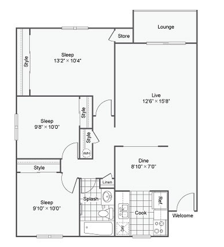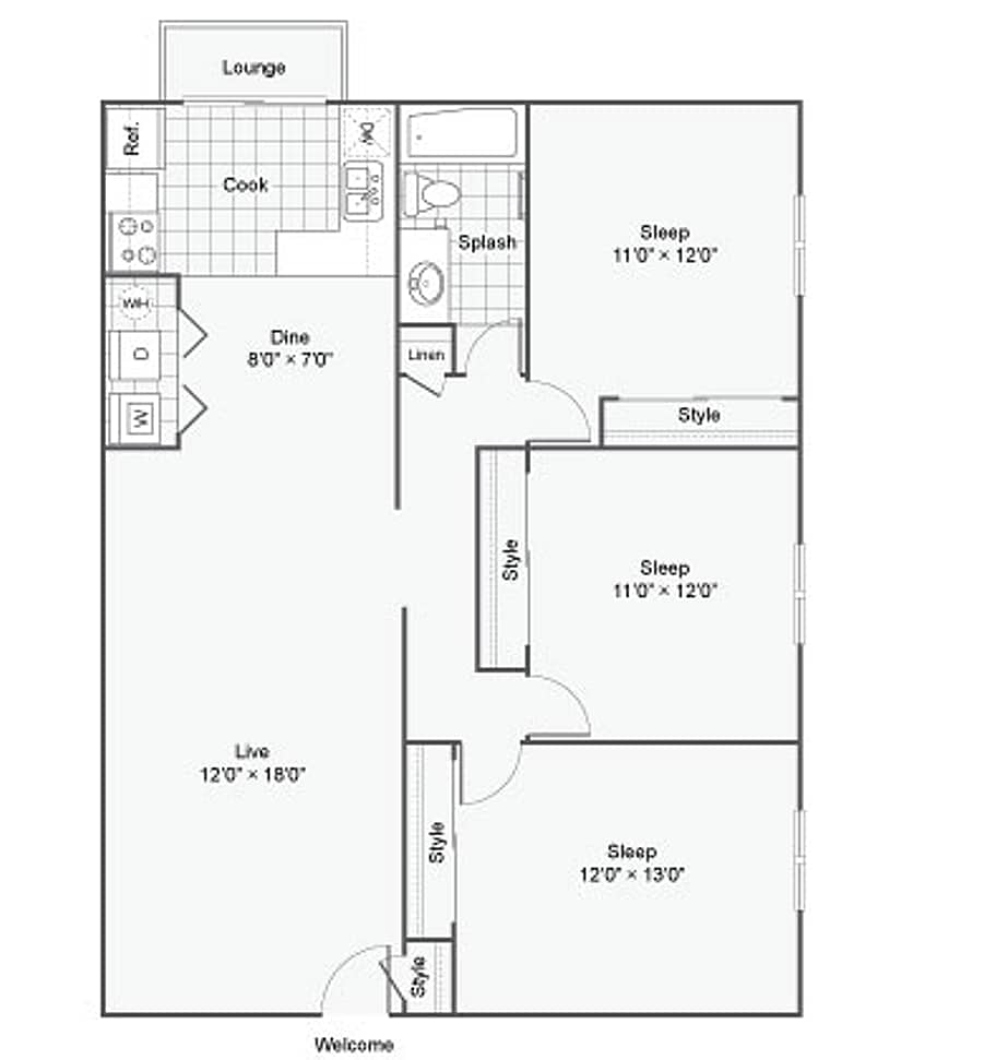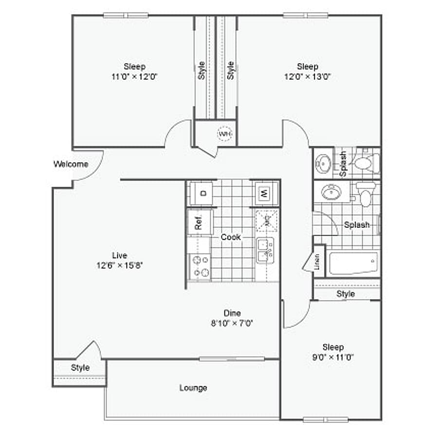 3 Beds, 1.5 Baths, 1300 sq ftLargest 3 BedroomThis is the largest 3 Bedroom at this PropertyModel Gallery