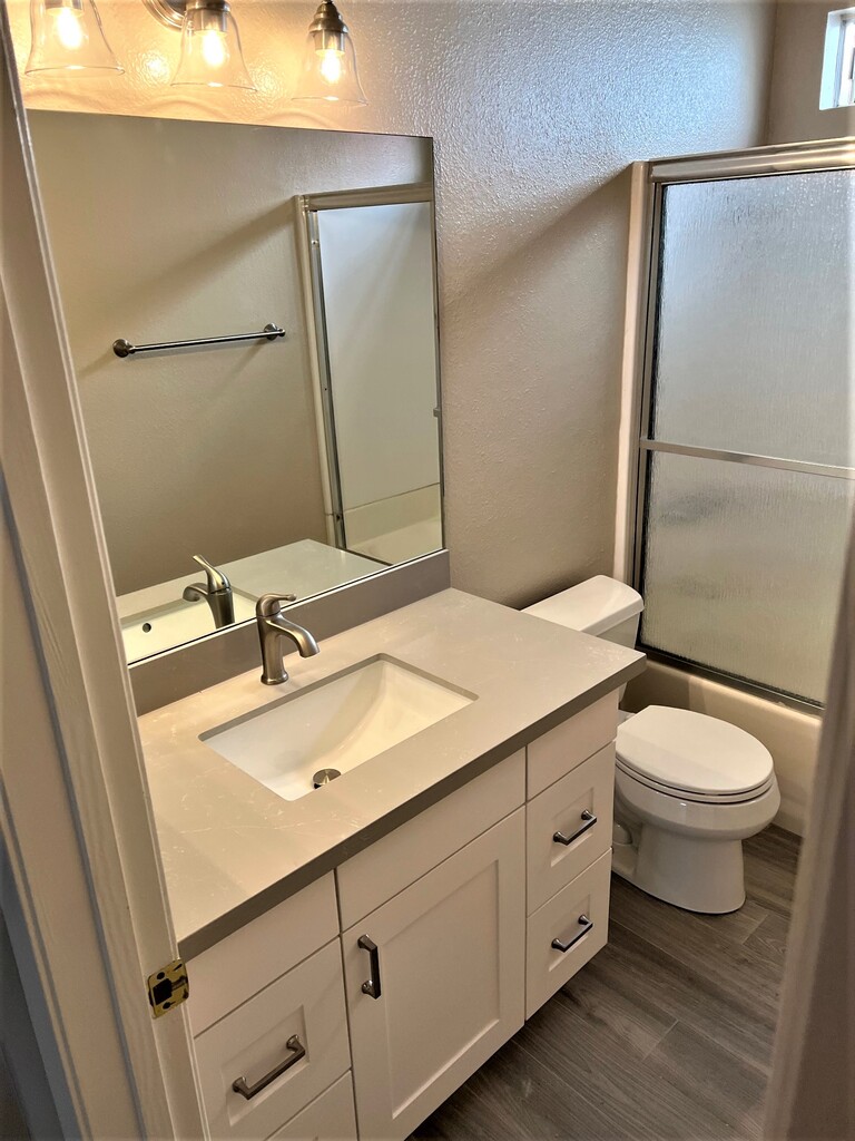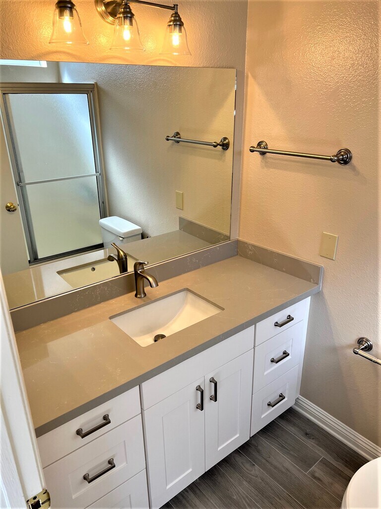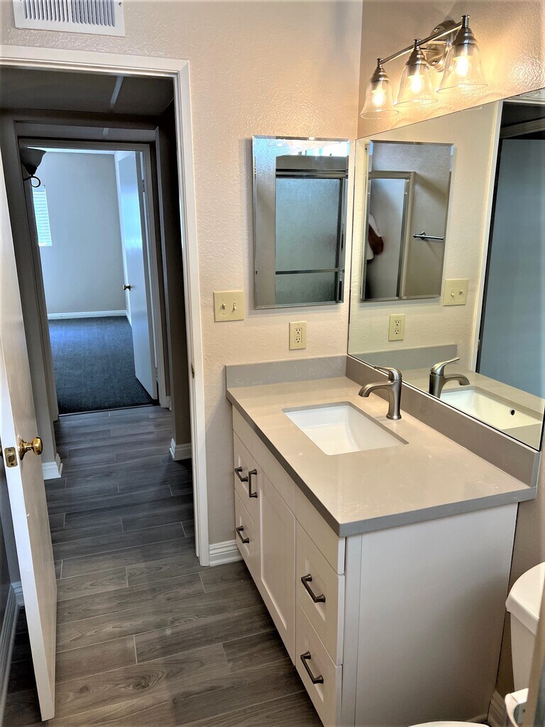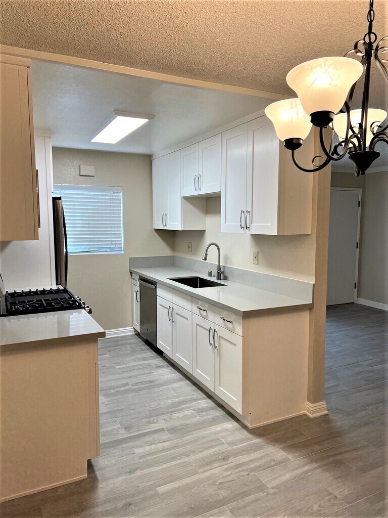 Upscale recent remodel in Prime Burbank Hills above Glenoaks BI. Newer kitchen with white Shaker style cabinets, w/ soft close drawers, quartz counter tops, upscale stainless steel appliances including gas stove/oven, counter depth upgraded refrigerator with ice maker, upgraded dish washer, stainless steel sink w/ sprayer faucet. High end durable wood grain plank flooring in living room, dining area, kitchen, hall and both full baths. Quality carpeting in both bedrooms. Crown molding in living & dining areas. Newer central air & heat system to ensure your comfort. Two spacious bedrooms, one in-suite. Mirrored closet doors. Both full baths are remodeled with white shaker style cabinets and quartz counter tops. 2 parking spaces in the gated parking garage are inlcuded no additional cost. Building access secured by locked gates and phone entry system. Laundry room on site. Water included. Convenient to shopping, restaurants, entertainment and transportation. Sorry no pets. Good credit required.