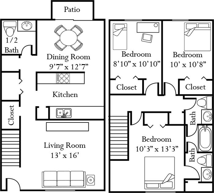 Three Bedroom and Two Baths - Floorplan 1 Three Bedroom Townhomes