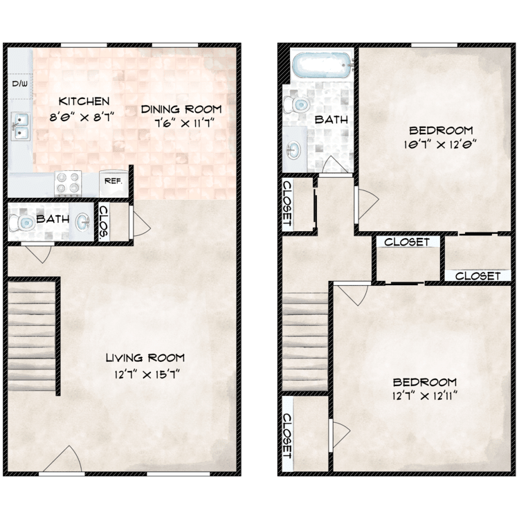Apartment Model: B2 Townhouse$1,2362 Bedroom, 1.5 Bath, 1400 sq ftUnavailableFloorplansPhotos![]()