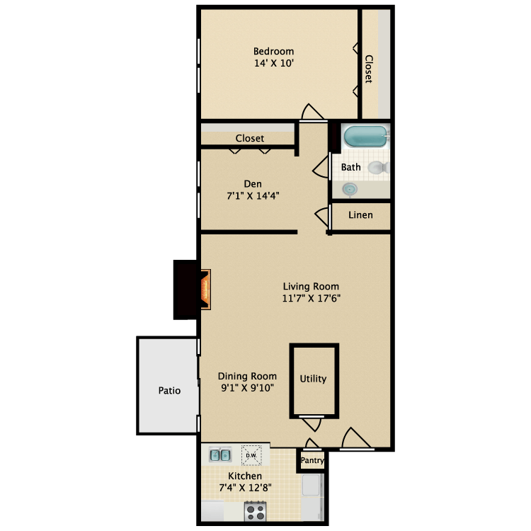 Apartment Model: 1 Bed 1 Bath with DenFrom $1,0151 Bedroom, 1 Bath, 900 sq ftAvailable Now![]()