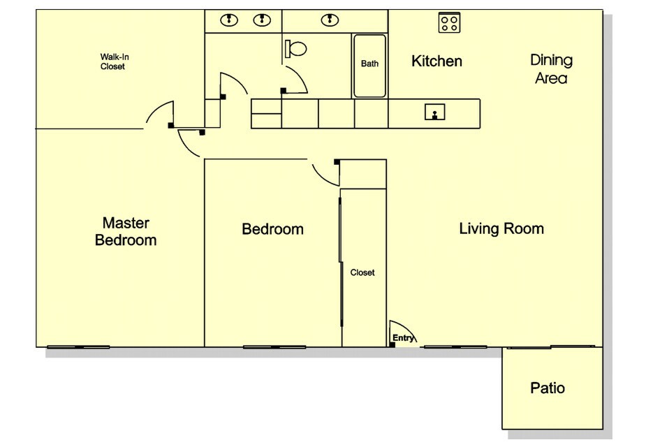 2 Bedroom, 1 Bath w/ Balcony - Floorplan 1 2 Bedroom, 1 Bath w/ Patio
