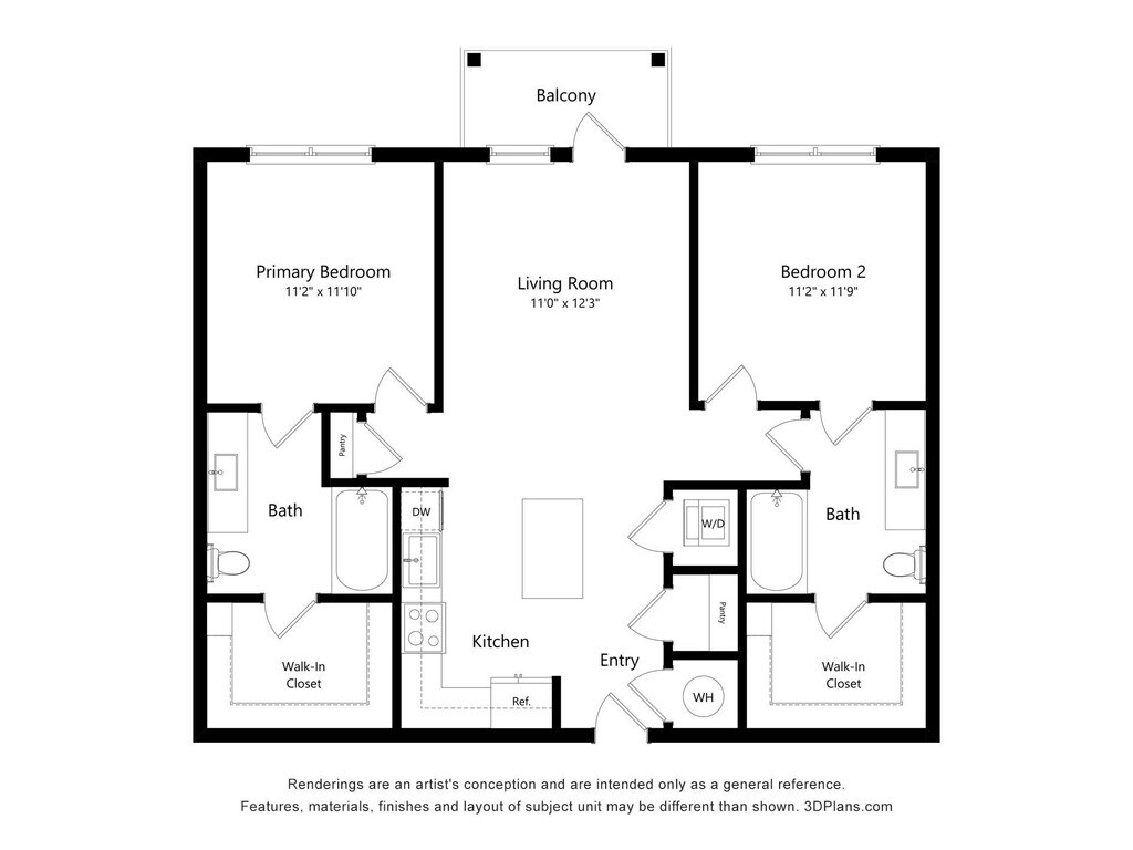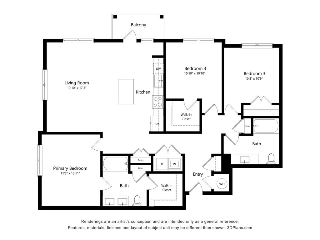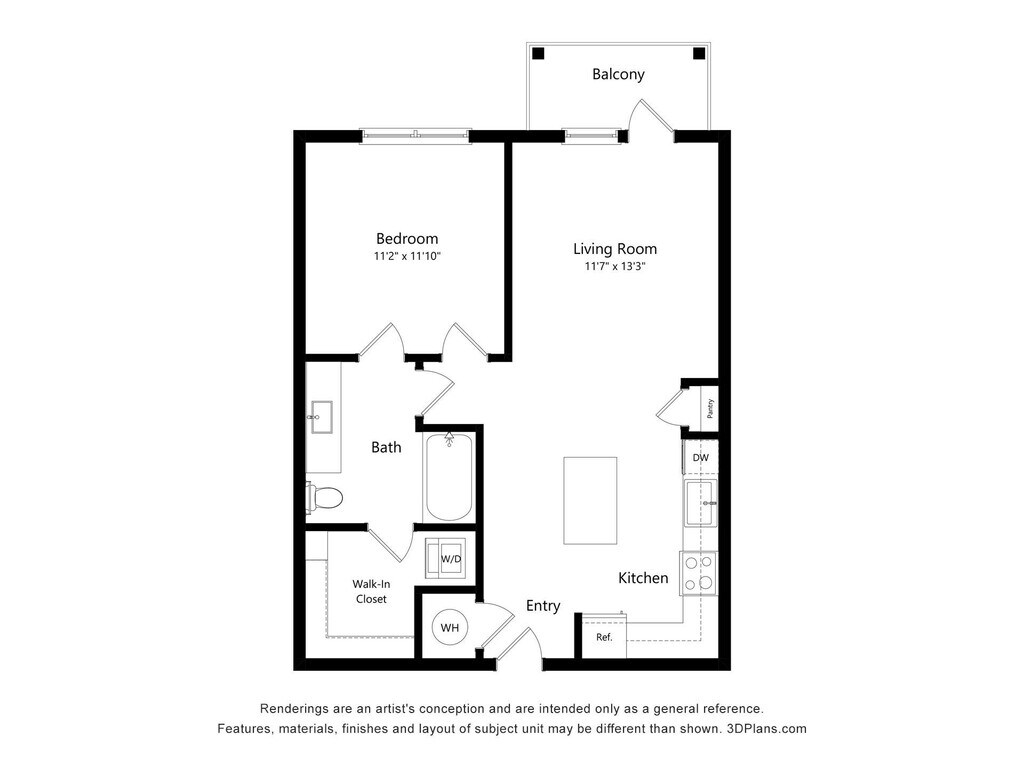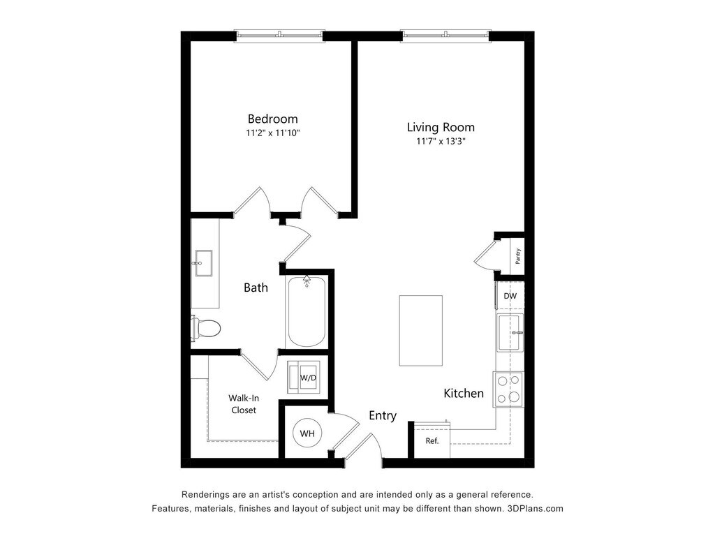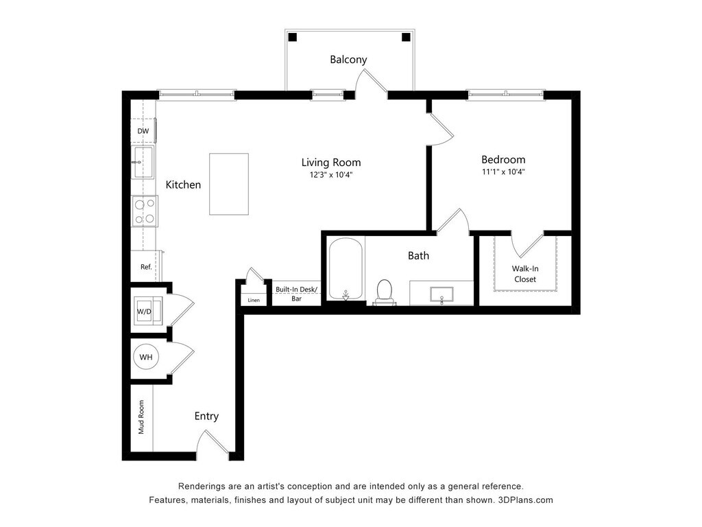 Apartment Model: A3From $1,6501 Bedroom, 1 Bath, 733 sq ftAvailable March 25, 2026Floor plans are artist's rendering. All dimensions are approximate. Actual product and specifications may vary in dimension or detail. Not all features are available in every rental home. Please see a representative for details.