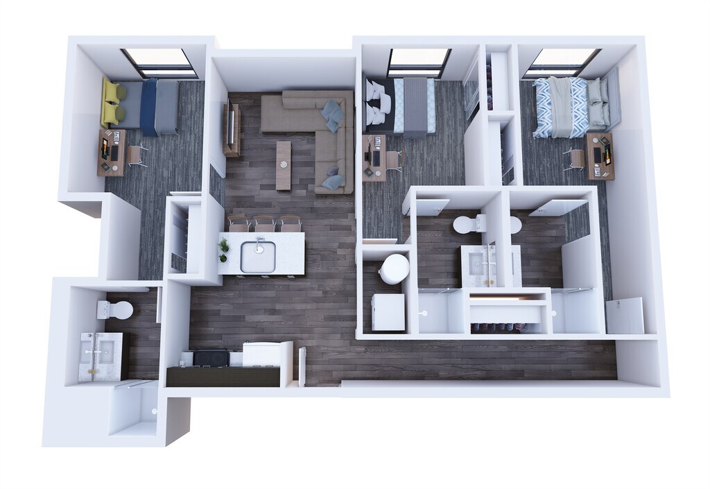3x3 A - Floorplan 1 Apartment Unit: PrivateApartment Model: 3x3 A$7693 Bedroom, 3 Bath, up to 982 sq ftAvailable August 13, 20263x3 B