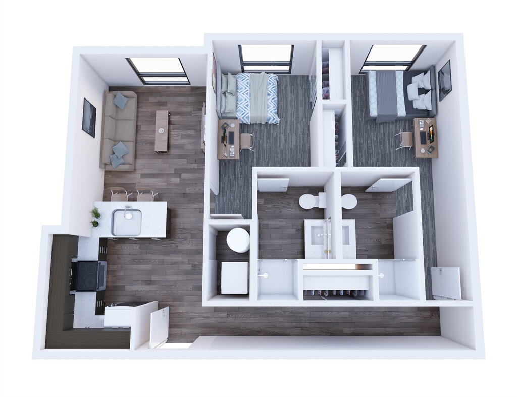 2x2 A - Floorplan 1 Apartment Unit: PrivateApartment Model: 2x2 A$8792 Bedroom, 2 Bath, up to 776 sq ftAvailable August 13, 20262x2 B