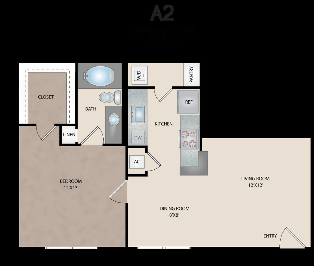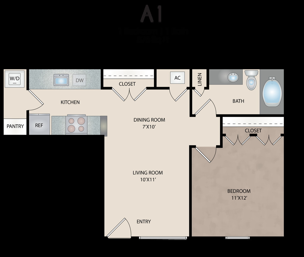 Apartment Model: A1From $1,2901 Bedroom, 1 Bath, 576 sq ftAvailable NowFloor plans are artist's rendering. All dimensions are approximate. Actual product and specifications may vary in dimension or detail. Not all features are available in every rental home. Prices and availability are subject to change. Base rent is based on monthly frequency. Additional fees may apply, such as but not limited to package delivery, trash, water, amenities, etc. Deposits vary. Please see a representative for details.