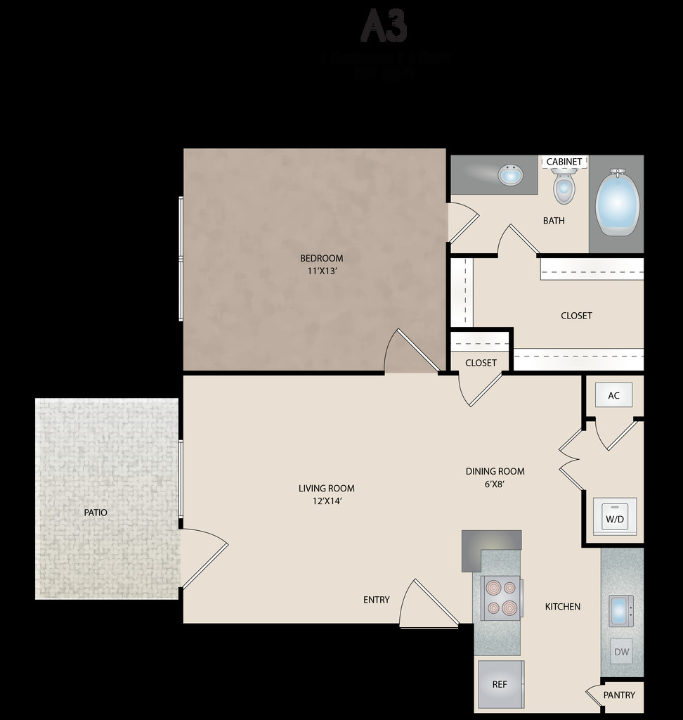 Apartment Model: A3$1,4601 Bedroom, 1 Bath, 591 sq ftAvailable NowFloor plans are artist's rendering. All dimensions are approximate. Actual product and specifications may vary in dimension or detail. Not all features are available in every rental home. Prices and availability are subject to change. Base rent is based on monthly frequency. Additional fees may apply, such as but not limited to package delivery, trash, water, amenities, etc. Deposits vary. Please see a representative for details.