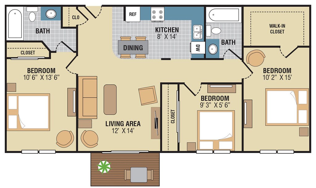 Apartment Model: 3 Beds, 2 baths3 Bedroom, 2 Bath, 1012 sq ftUnavailable![]()