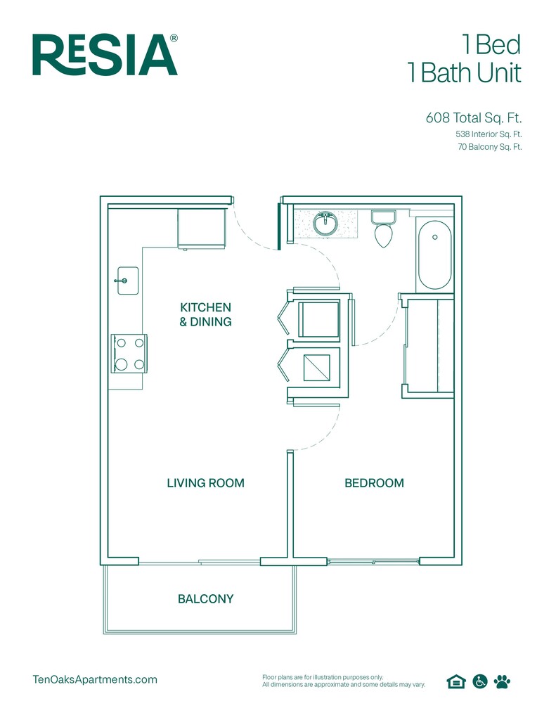 1 Bed, 1 Bath, 608 sq ftAvailable NowModel Gallery