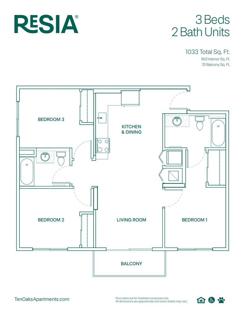 Resia Ten Oaks offers 1 to 3 Bedroom apartments starting from $1,205 and having 608–1,033 sq ft. Here is the current pricing and availability: