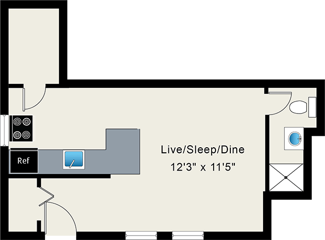 S15 - Floorplan 1 Apartment Unit: 001BApartment Model: S15Studio, 1 Bath, 416 sq ftAvailable Now![]()
