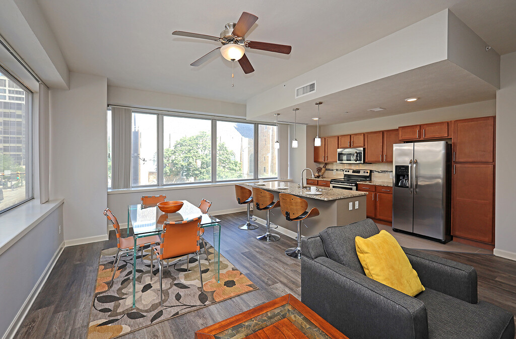June 7, 2017I have lived here for 9 months ad have had a very positive experience overall. I have my disagreements with management every now and again, but overall they are as accommodating as they are empowered to be by the corporate office. Security is friendly and helpful in managing packages, dry-cleaning, and general inquiries as they can. The garage is one of the cheapest in town, and even though they tried raising the rates twice in one year it STILL would have been the cheapest. However, after ...feedback from residents the price raise was delayed indefinitely. Maintenance is prompt and as helpful as they are empowered to be. I have had no problems with their fixes whether I am in the apartment or not. Emergency maintenance is also very responsive. The unit is as well constructed as any new, residential convert is anymore. Appliances are modern and functional. Cabinet storage is adequate for a one-bedroom unit. Closet is spacious and fits my large wardrobe with room left over for auxiliary storage. Bathroom is large and functional with adequate storage and a linen closet. The living room / kitchen area has a wall of windows with gorgeous views (depending on which side of the building you are on). The only down side to these is the heat loss in the winter (there is roughly a 10 degree difference between the thermostat in the hallway and the window area). The bedroom, however, is interior and therefore unaffected by this. I live on the second floor near the weight room, and occasionally notice some noise form this, but overall the noise level is much quieter than expected.If I am near the door i can sometimes hear some shuffle in the hallway or the bump of someone upstairs or to the side, but never obscene noise. Speaking of this, the weight room is more than adequate for the routine workout. The party room on the 4th floor is spacious and nice for the occasional community event as well. Overall, if you are looking for a professional, welcoming apartment for a fair price in the downtown area, look no further. I have friend that live in apartments all over the city and still plan to stay here for the duration of my stay in the Downtown area.Property Manager Responded
