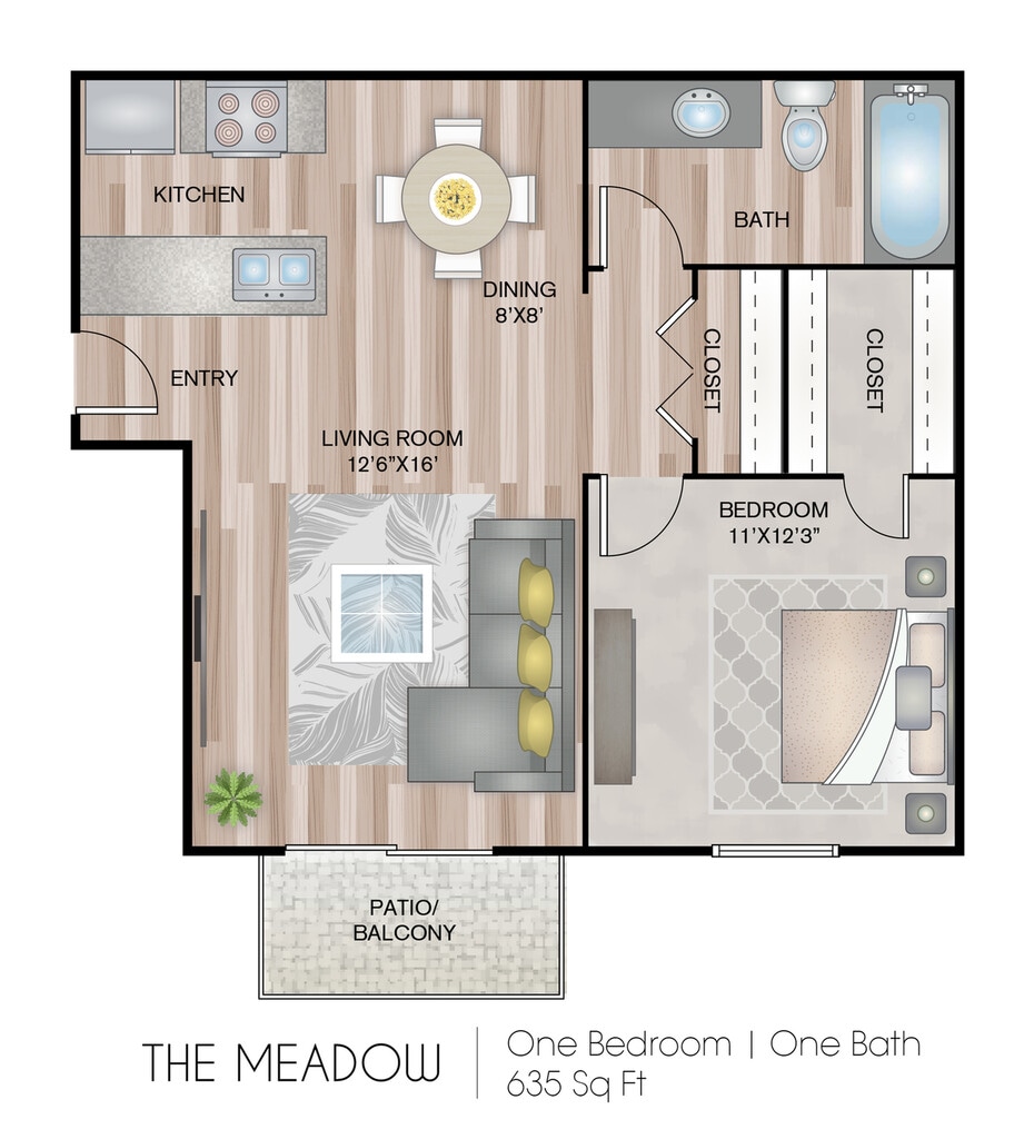 Apartment Model: The MeadowFrom $1,4701 Bedroom, 1 Bath, 635 sq ftAvailable Now![]()
