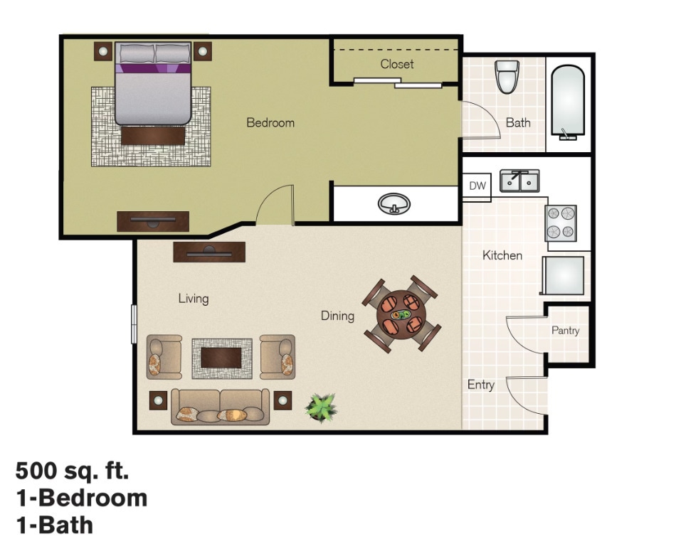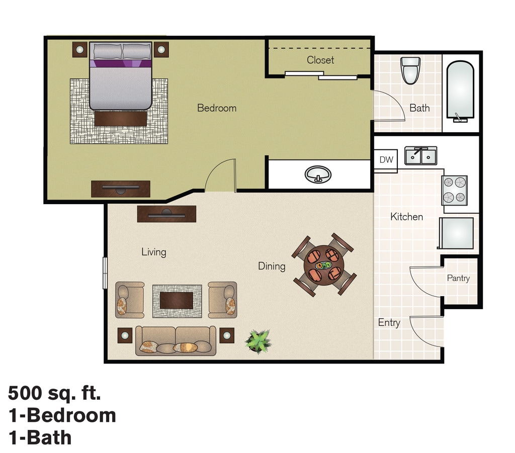 1 Bed, 1 Bath, 500 sq ftAvailable NowModel Gallery