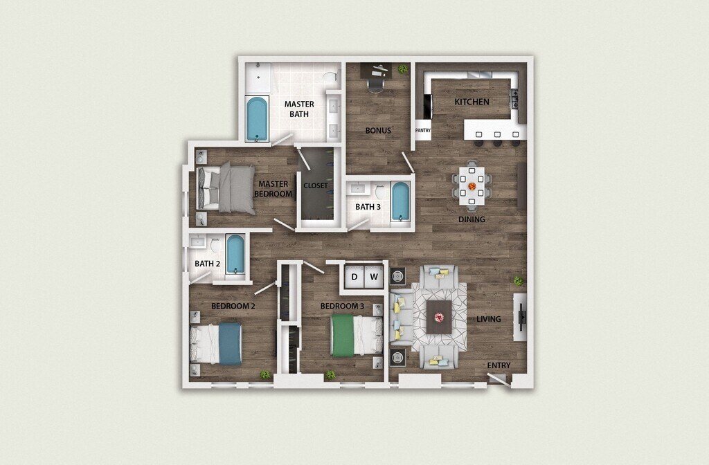 Apartment Model: 3 Bedroom Plus Bonus Room3 Bedroom, 3 Bath, 1493 sq ftAvailable December 1, 2025![]()