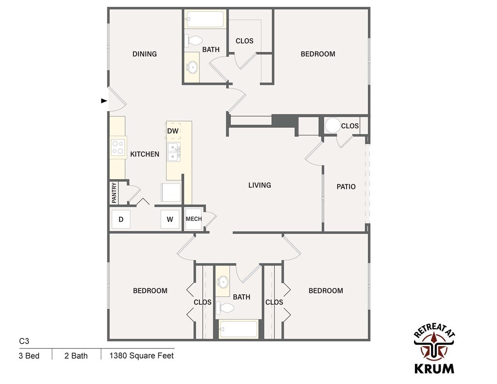 3 Beds, 2 Baths, 1380 sq ftAvailable NowLargest 3 BedroomThis is the largest 3 Bedroom at this PropertyModel Gallery
