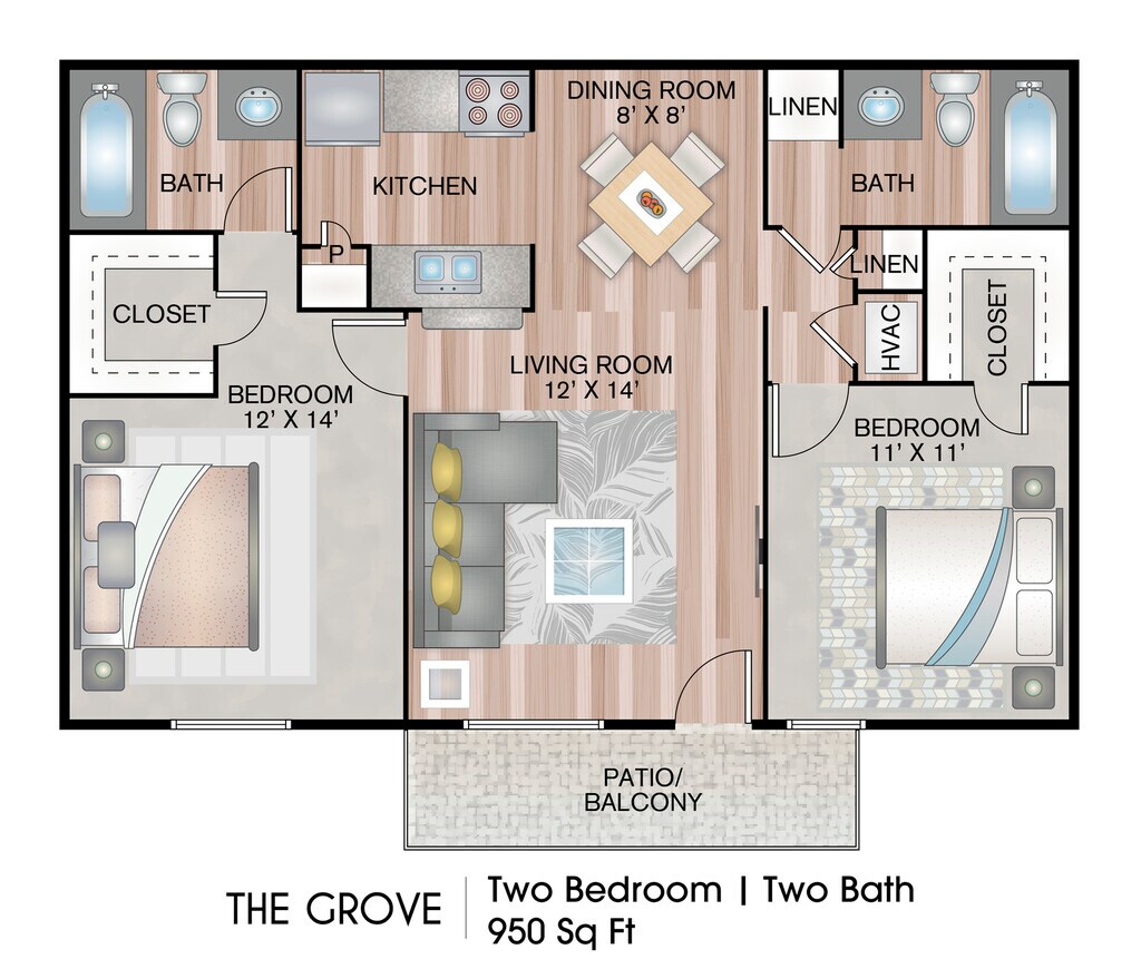 The Grove - Floorplan 1 Apartment Unit: 00-002Apartment Model: The GroveFrom $8802 Bedroom, 2 Bath, 950 sq ftAvailable NowApartment Unit: 00-008Apartment Model: The GroveFrom $9002 Bedroom, 2 Bath, 950 sq ftAvailable NowApartment Unit: 02-210Apartment Model: The GroveFrom $8802 Bedroom, 2 Bath, 950 sq ftAvailable Now