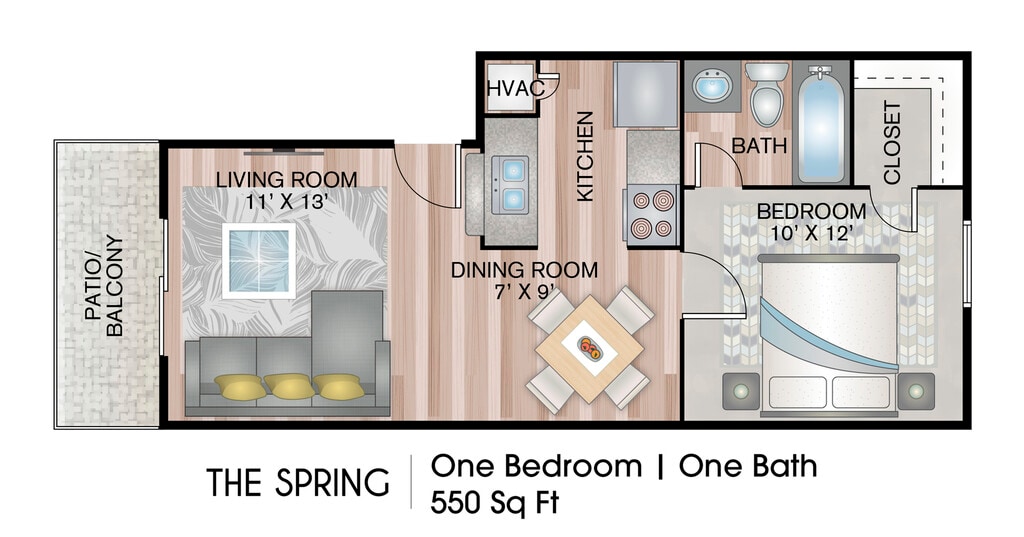 Apartment Model: The SpringCall For Rates1 Bedroom, 1 Bath, 550 sq ftUnavailable![]()