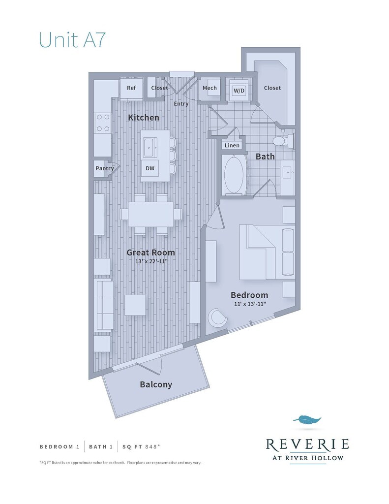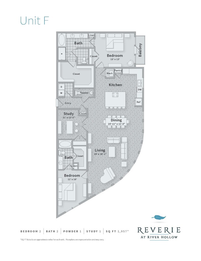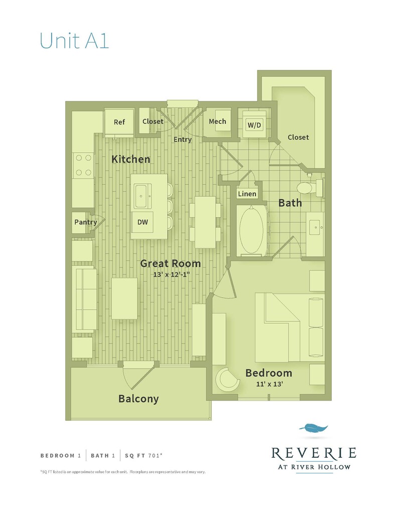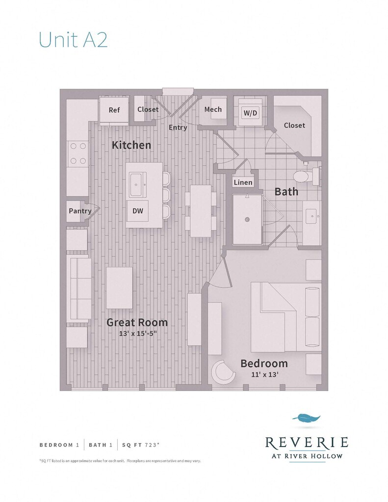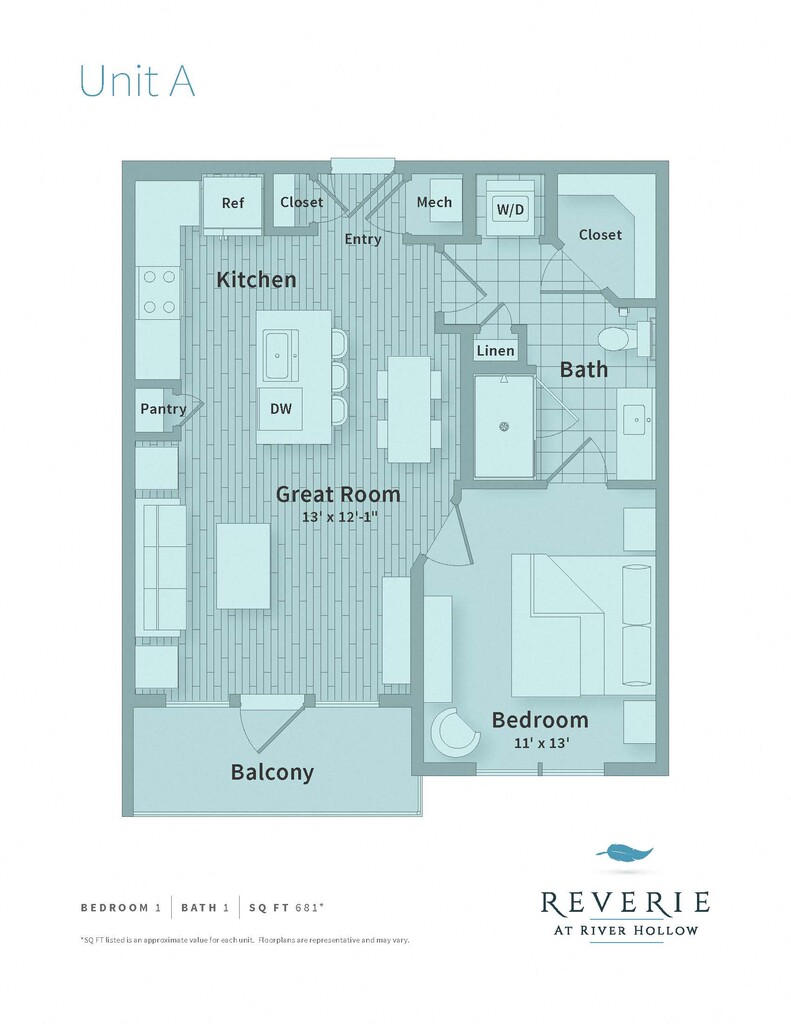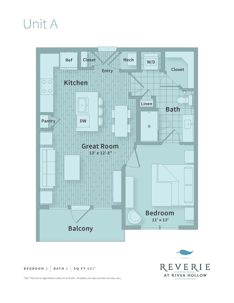 Reverie at River Hollow offers 1 to 3 Bedroom apartments starting from $1,612 and having 558–1,957 sq ft. Here is the current pricing and availability:
