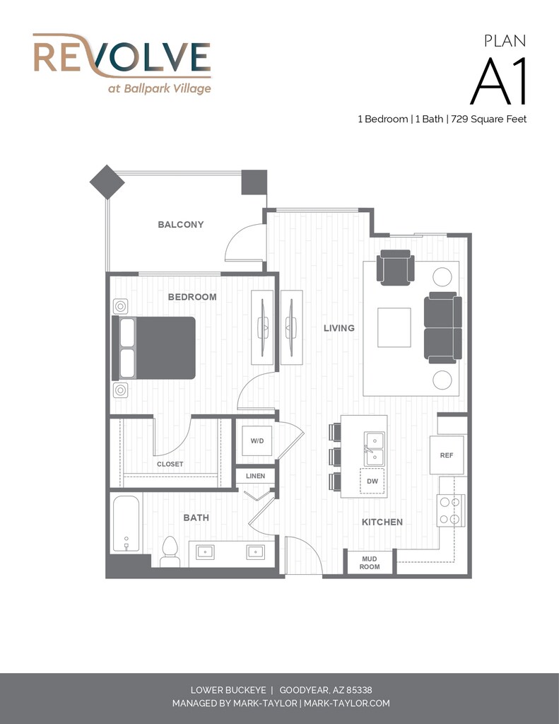 Apartment Model: 1 Bed/1 Bath1 Bedroom, 1 Bath, 729 sq ftAvailable Now![]()