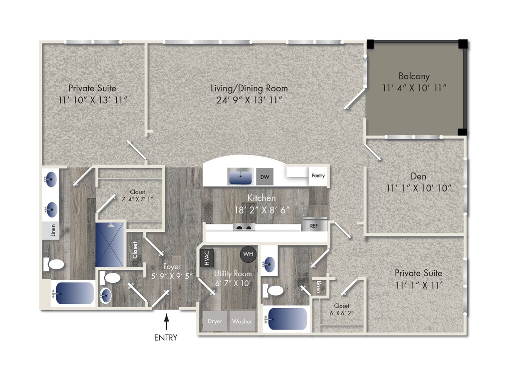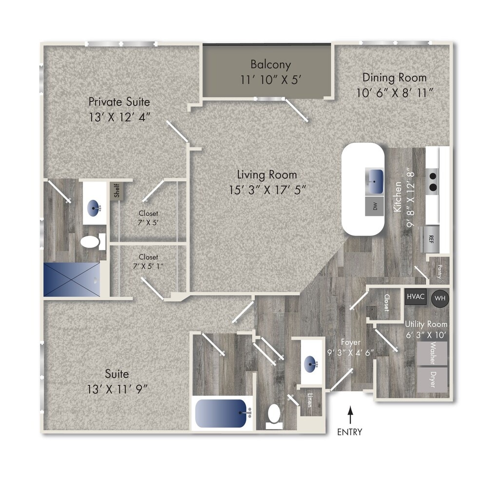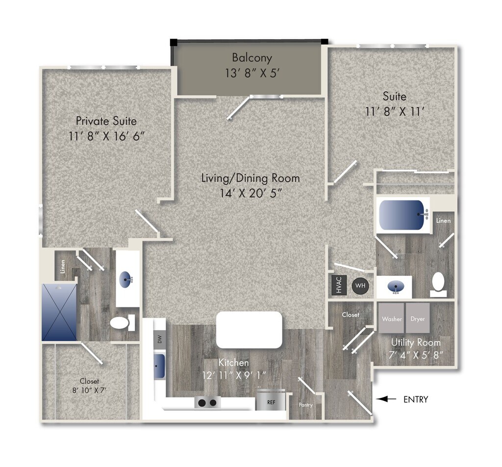 2 Beds, 2.5 Baths, 1439 sq ftLargest 2 BedroomThis is the largest 2 Bedroom at this PropertyModel Gallery
