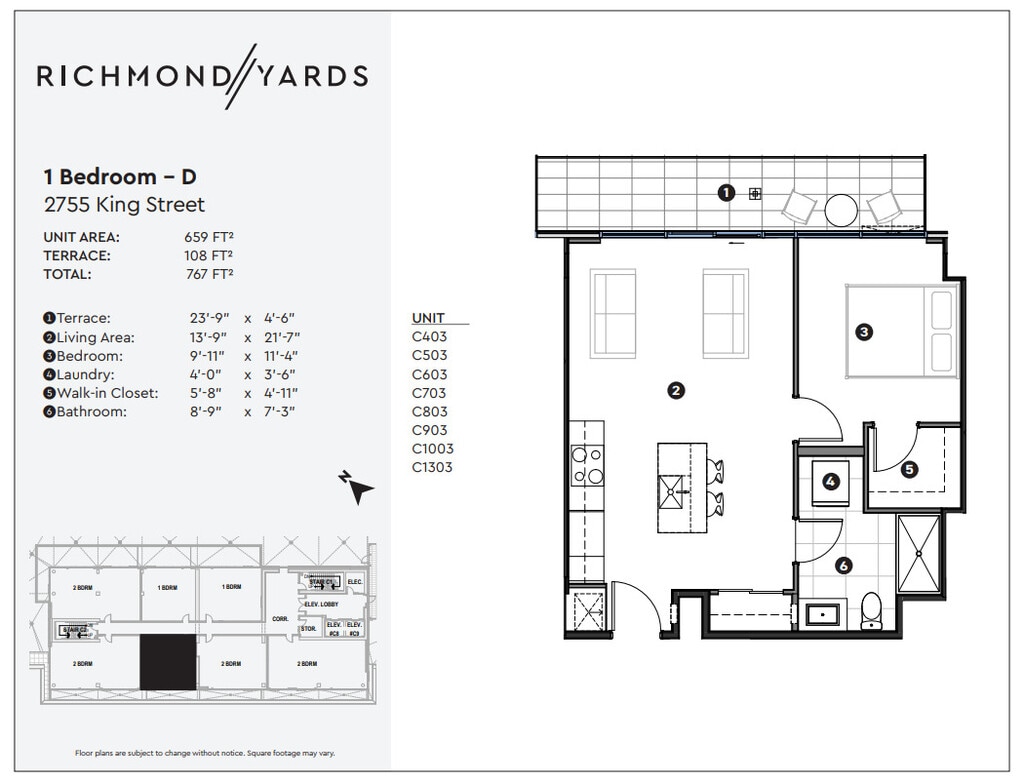 Richmond Yards offers 1 to 3 Bedroom apartments starting from C$1,795 and having 589–1,380 sq ft. Here is the current pricing and availability:
