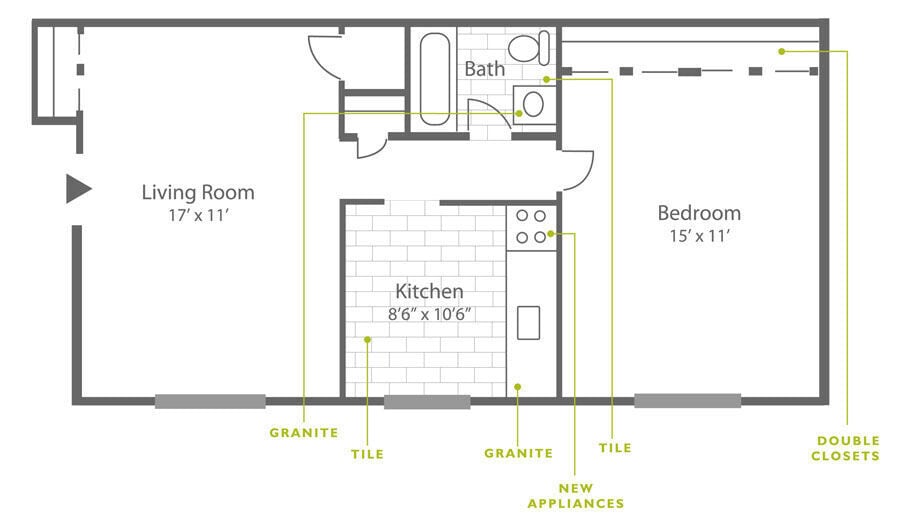 1 Bed, 1 Bath, 525 sq ftAvailable NowModel Gallery