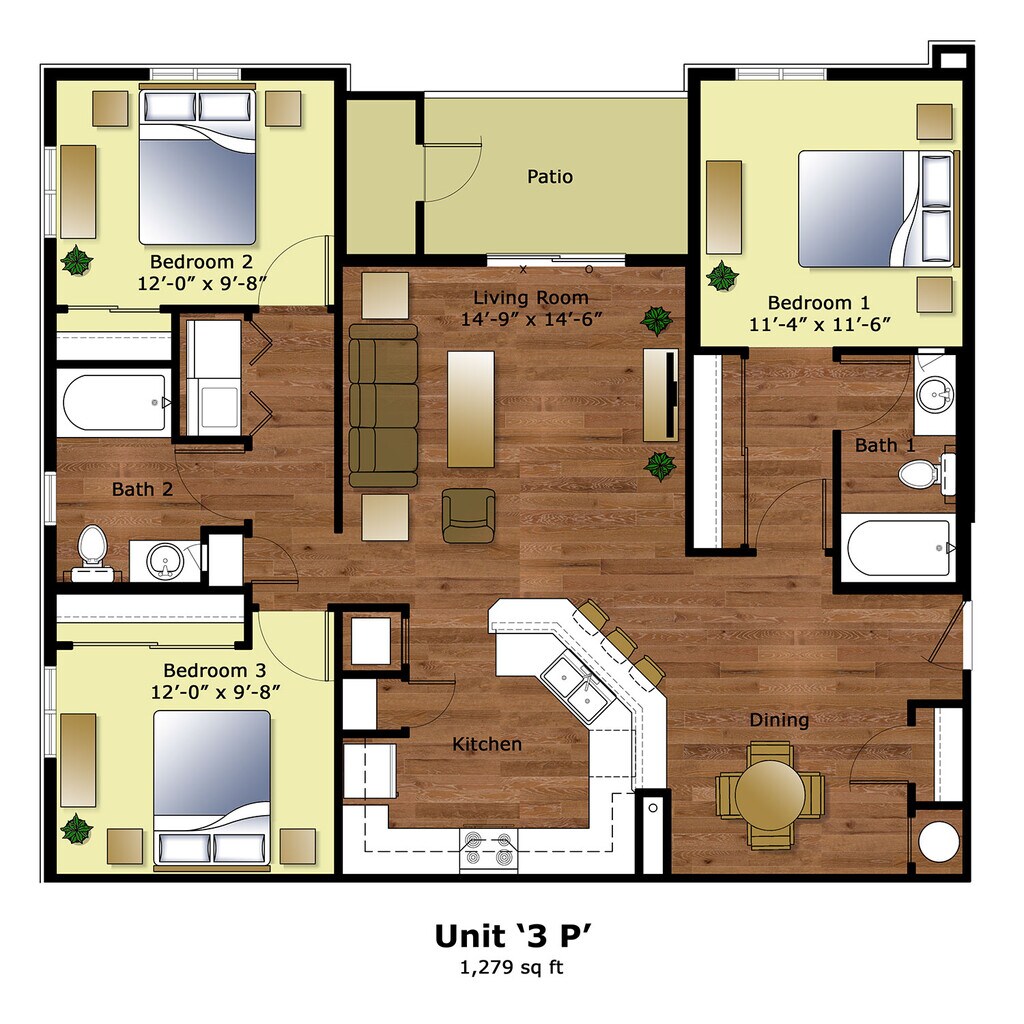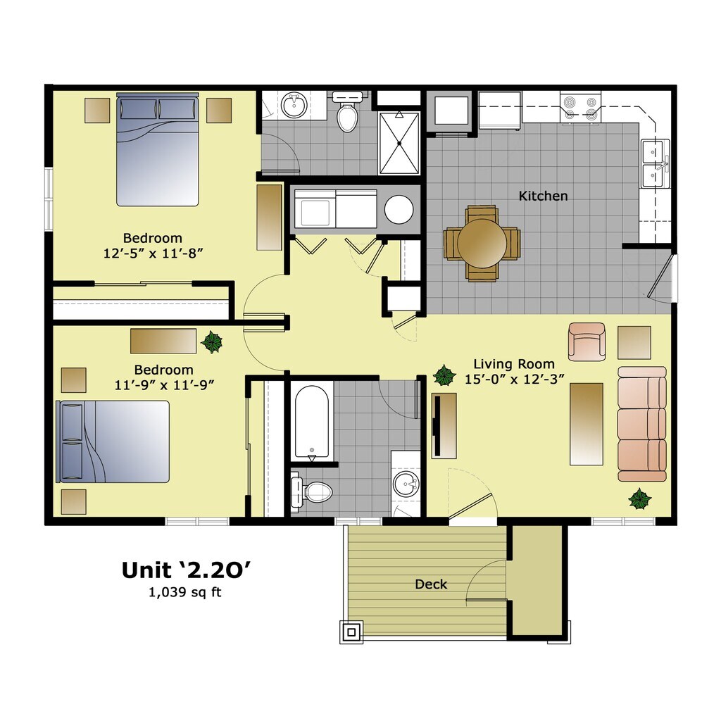 2 Beds, 2 Baths, 1175 sq ftAvailable Dec 15Largest 2 BedroomThis is the largest 2 Bedroom at this PropertyModel Gallery