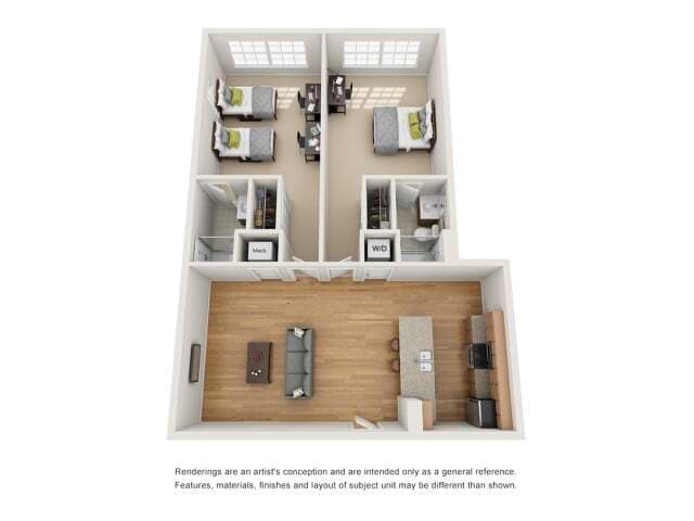 2 Beds, 2 Baths, 1300 sq ftAvailable Aug 17Largest 2 BedroomThis is the largest 2 Bedroom at this PropertyModel Gallery