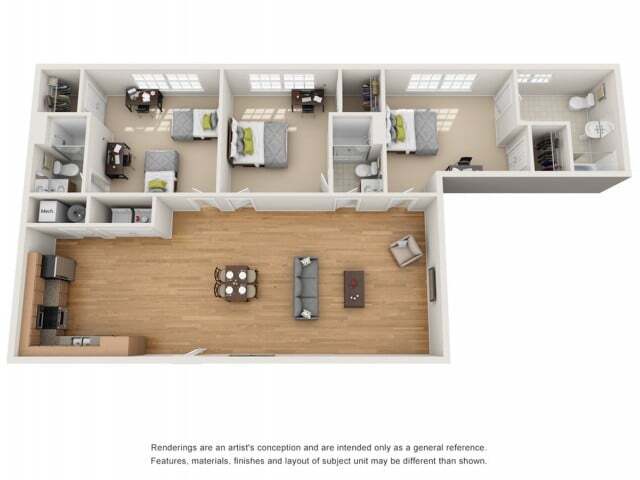 Apartment Model: 3x3$1,4103 Bedroom, 3 Bath, 1250 sq ftAvailable August 17, 2026![]()