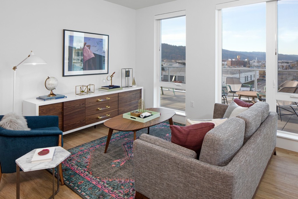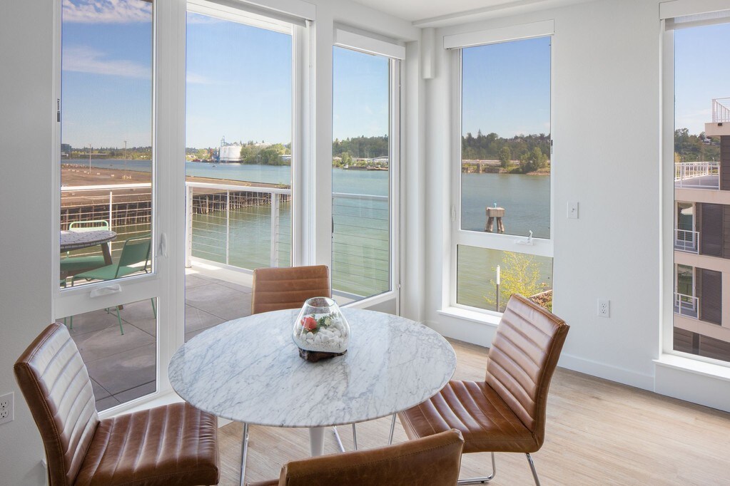Welcome to Rivage, a pet-friendly community overlooking the Willamette River, with spacious and contemporary studio, one, and two bedroom homes. Our smoke-free Waterfront apartments in Portland are beautifully designed, featuring large windows with views of the water and city, quartz countertops, two-toned cabinetry, walk-in closets, private balconies or patios, and Energy Star appliances that include full-size washer and dryer sets. Our amenity-rich community includes multiple courtyards, a fully-equipped fitness center, a yoga/Pilates studio, a rooftop deck with views of the surrounding scenery, and a convenient community lounge offering Wi-Fi, game tables, TVs, and more. We offer flexible touring options - call or text us today to schedule yours!