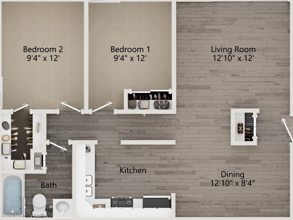 2 Beds, 1 Bath, 750 sq ftAvailable NowModel Gallery