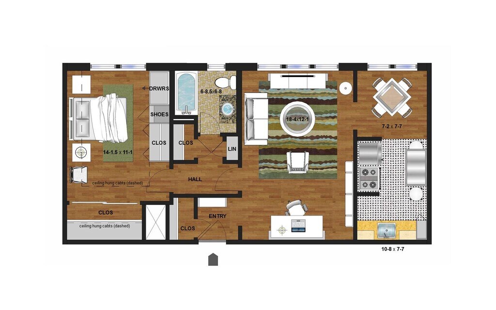 1 Bedroom - Floorplan 1 Apartment Unit: 106Apartment Model: 1 Bedroom$1,2111 Bedroom, 1 Bath, 715 sq ftAvailable June 1, 2026